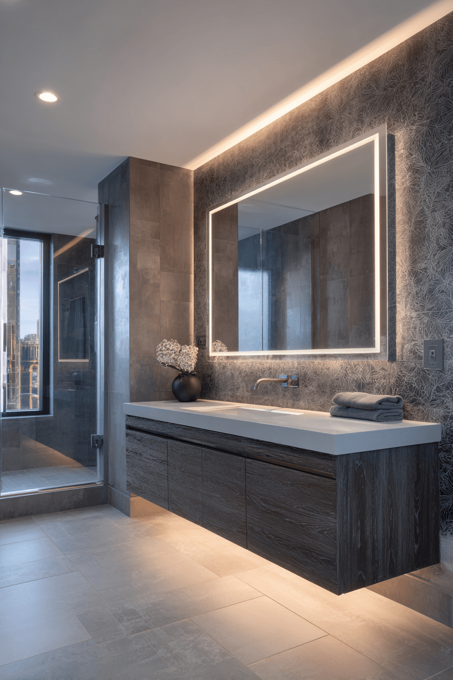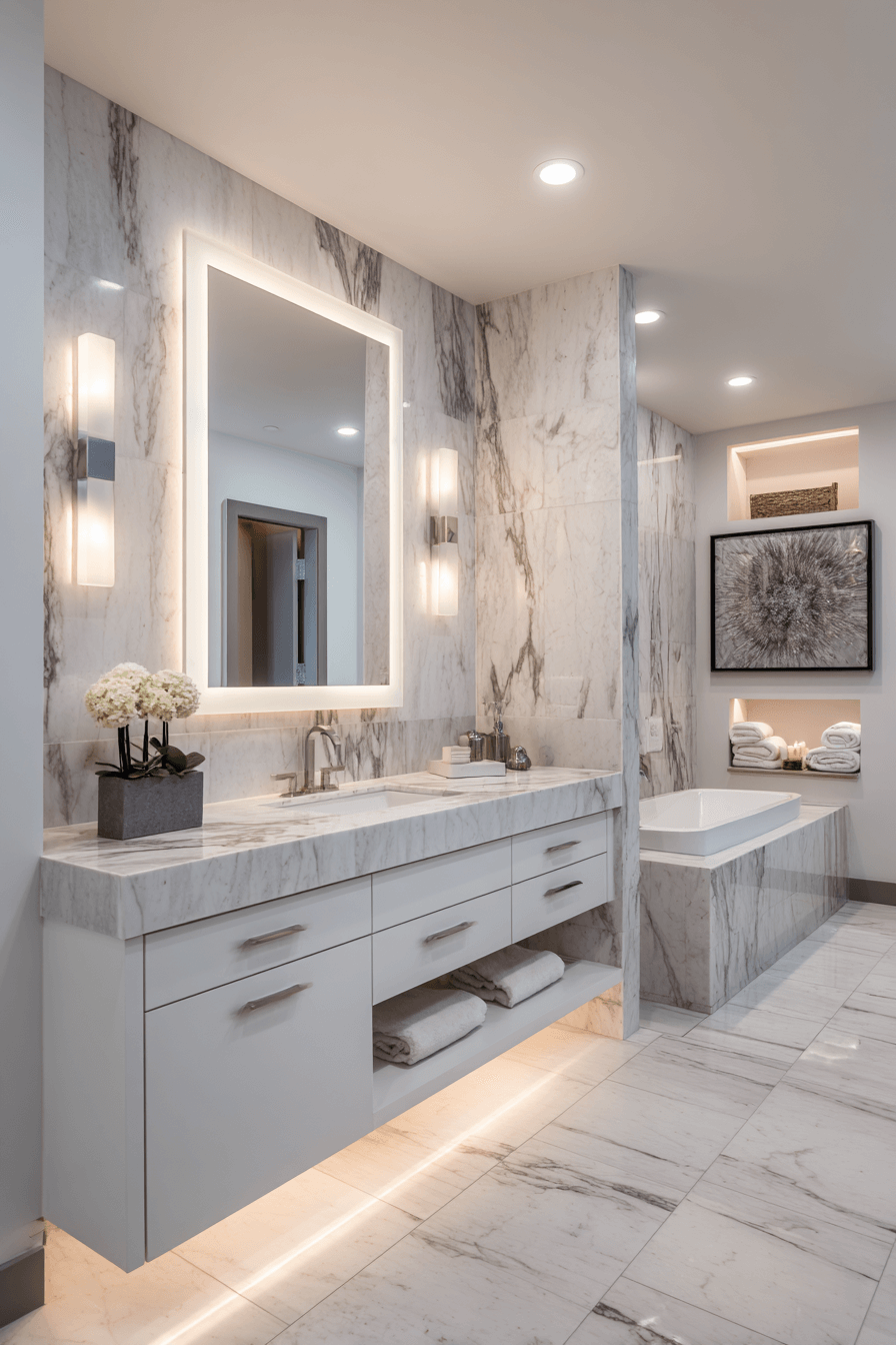 Backlit Mirror Features are illuminating 2026 bathroom trends with sleek, integrated LED lighting. These mirrors provide even illumination while creating a soft halo effect against the wall. The subtle glow enhances ambiance and reduces the need for bulky light fixtures. Paired with floating vanities and clean-lined cabinetry, they feel ultra-modern. This trend works because it merges practicality with elevated aesthetics. Click to brighten your bathroom with a modern backlit mirror.
