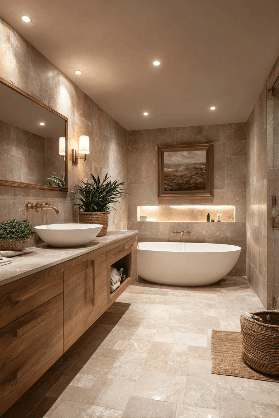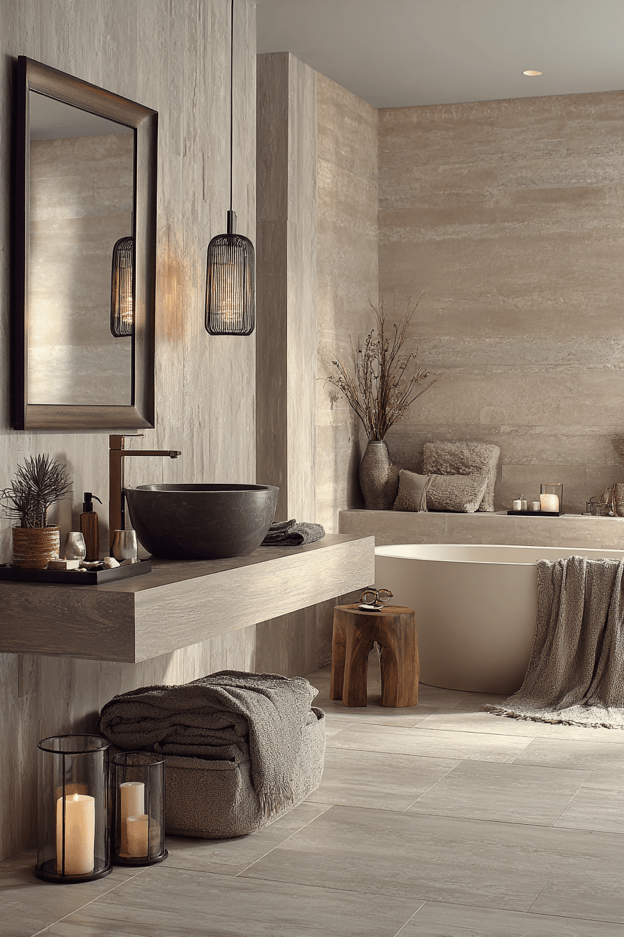 Organic Modern Serenity blends raw textures with clean lines, making it a defining style in 2026 bathroom trends. Think wood slat accents, stone countertops, matte black fixtures, and creamy neutral walls. The mix of natural materials and contemporary shapes creates balance and warmth. Soft lighting enhances the tranquil atmosphere without overpowering the simplicity. This approach works because it feels both elevated and approachable. Explore how to design your own organic modern retreat.