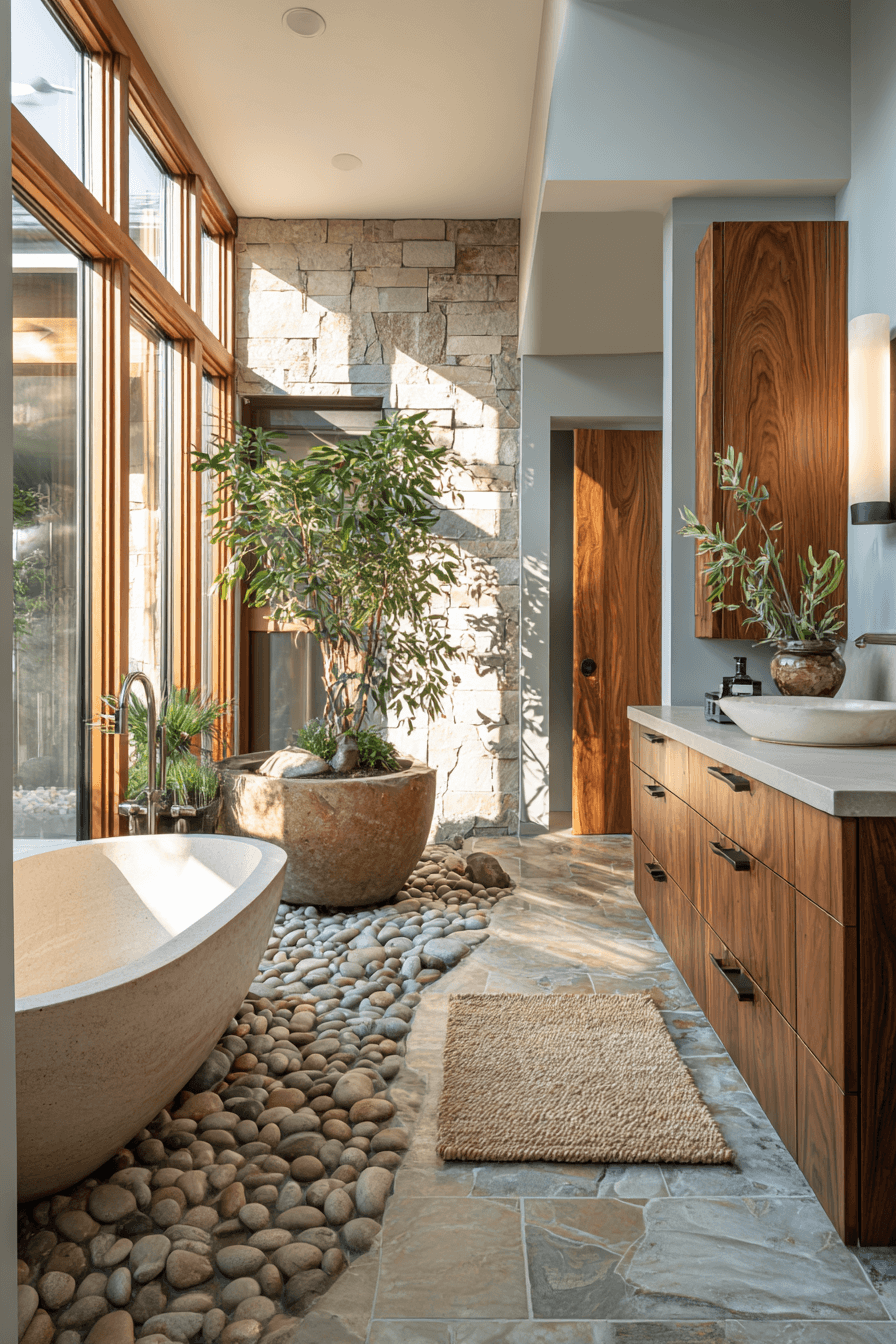 Nature-Infused Wellness Spaces are central to 2026 bathroom trends, focusing on organic materials and calming greenery. Natural wood vanities, stone sinks, indoor plants, and soft daylight combine to create a grounding atmosphere. Earth-toned tiles and textured walls enhance the sensory experience. This approach turns the bathroom into a peaceful escape from digital overload. It works because wellness and mental clarity are becoming top design priorities. Tap to bring natural harmony into your bathroom design.