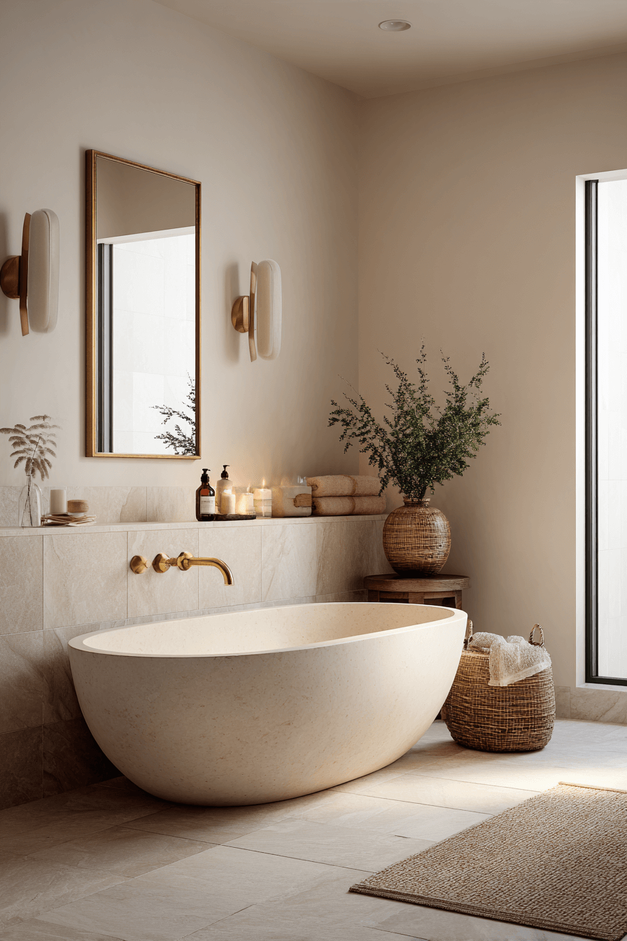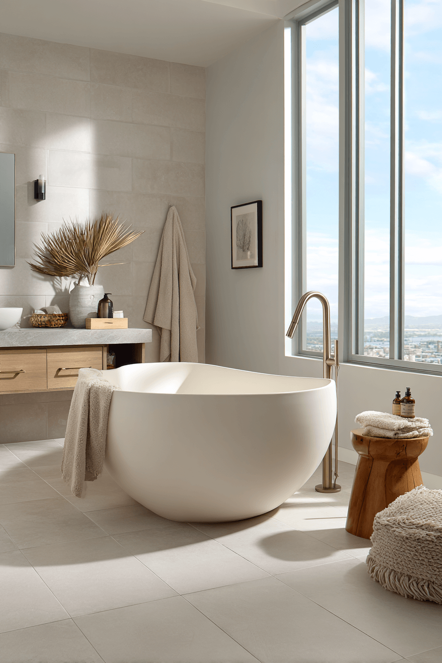 Sculptural Soaking Tubs are a statement centerpiece in 2026 bathroom trends, turning functionality into art. Freestanding tubs with organic shapes, matte finishes, or textured exteriors command attention while maintaining elegance. Positioned strategically near windows or under statement lighting, they elevate the entire room. These tubs invite relaxation and make self-care feel intentional and indulgent. Their bold presence works because modern homeowners want bathrooms that feel like luxury retreats rather than purely utilitarian spaces. Click to explore stunning soaking tub inspirations.