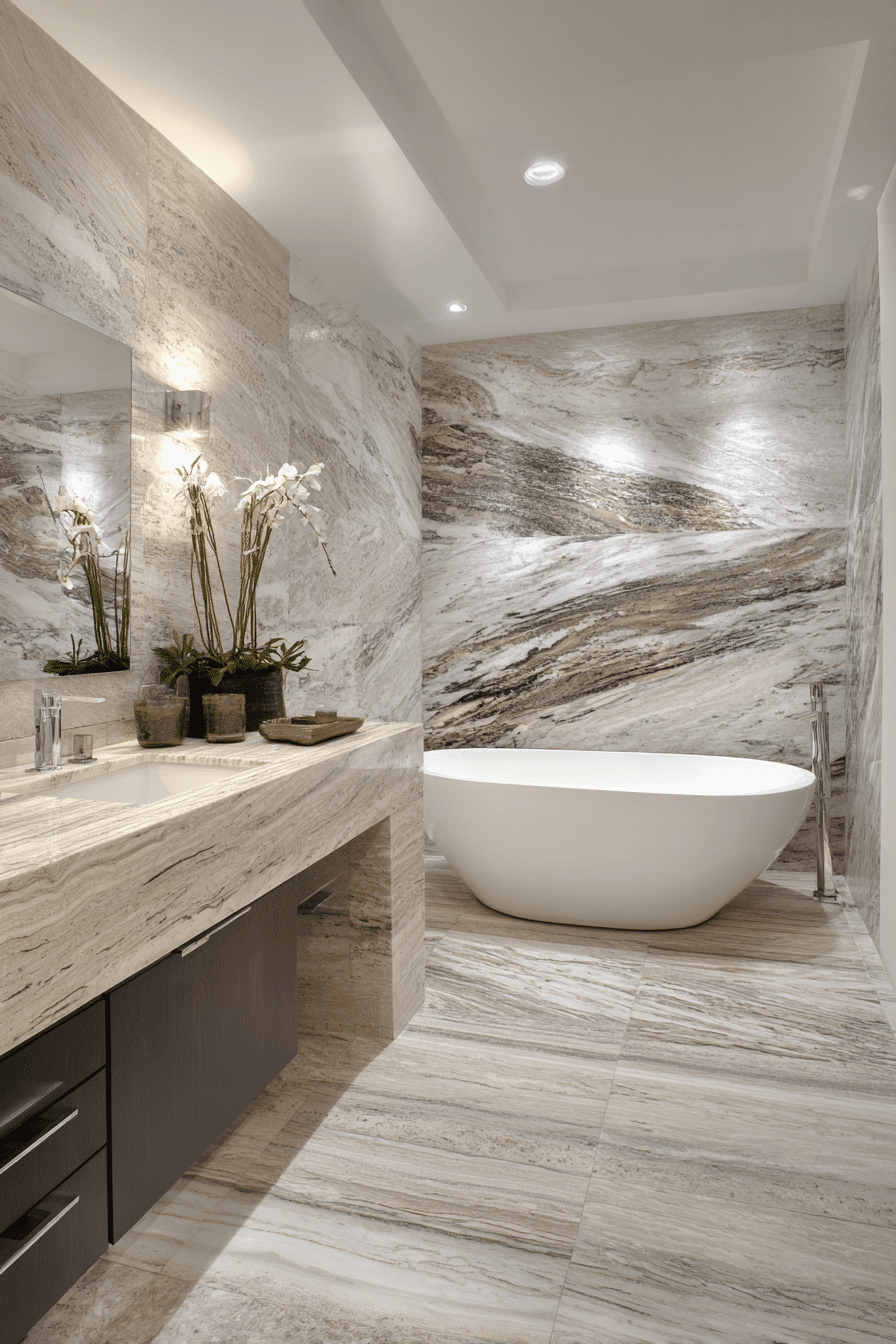 Stone-Drenched Sanctuaries are dominating 2026 bathroom trends with dramatic slabs of marble, travertine, and limestone covering walls, floors, and vanities. By extending stone across multiple surfaces, the space feels cohesive, luxurious, and timeless. Large-format slabs eliminate grout lines, creating a seamless and high-end aesthetic. Natural veining adds organic artistry that feels both grounded and elevated. This trend resonates because homeowners are craving durability paired with undeniable visual impact. Explore how stone can transform your bathroom into a sanctuary of modern elegance.