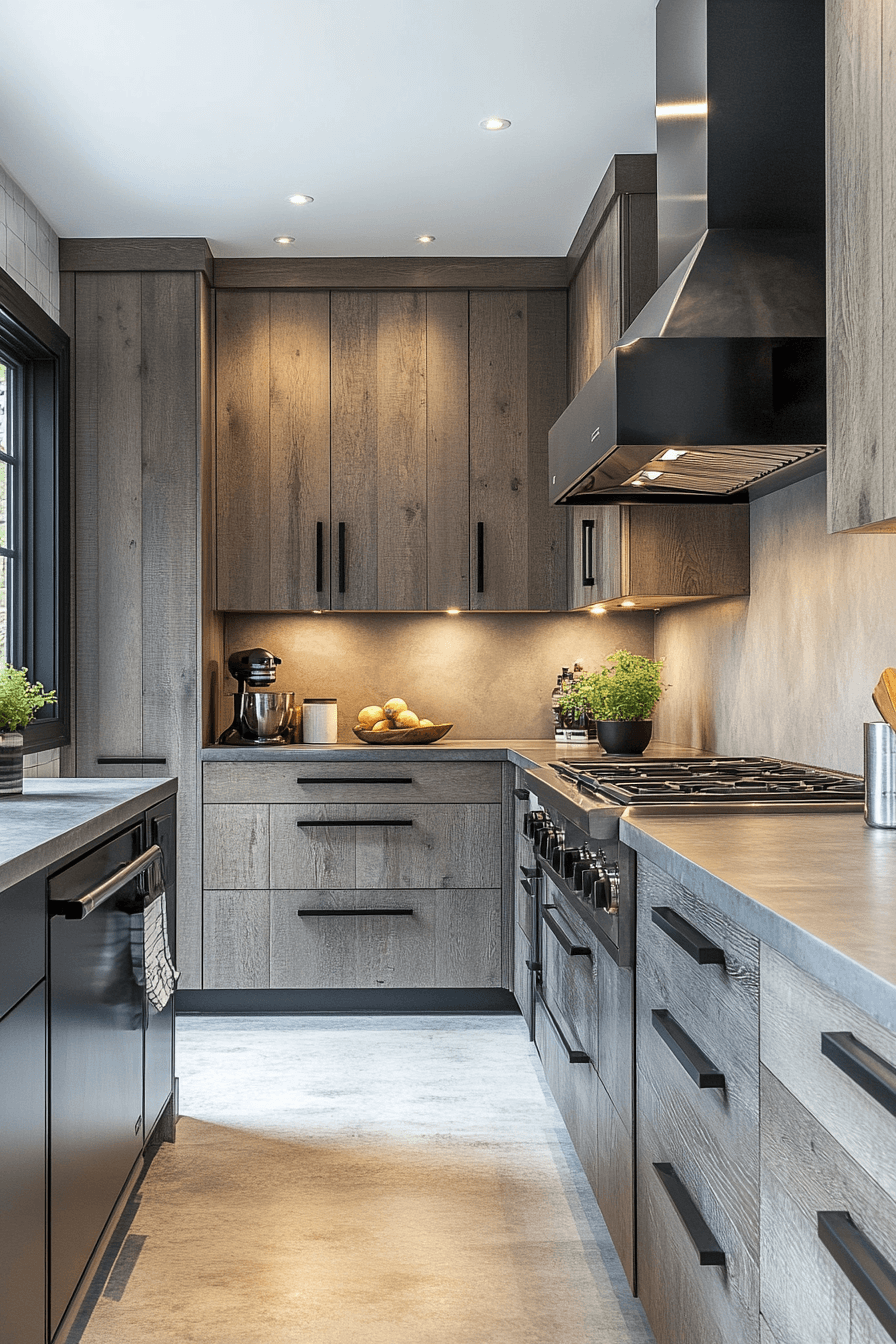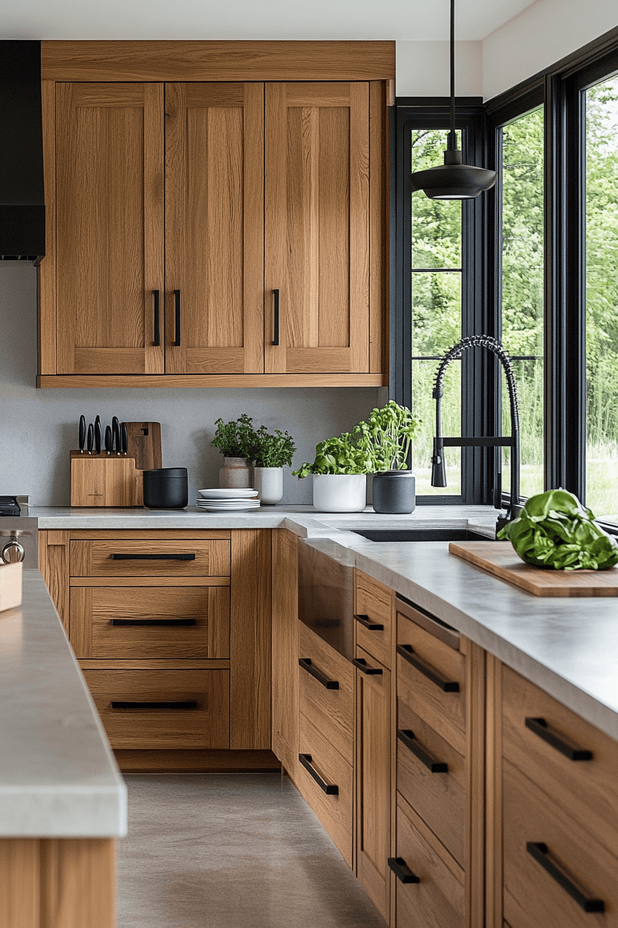 Contemporary rustic design blends clean forms with natural materials like hickory kitchen cabinets. Use flat-front doors, matte hardware, and sleek countertops for a current feel. The hickory brings depth and texture while maintaining a clean aesthetic. This look is ideal for anyone wanting rustic charm in a modern package. Add greenery or textured backsplashes to enhance the contrast. Click for contemporary kitchens with rustic soul!