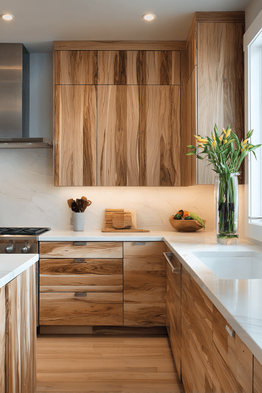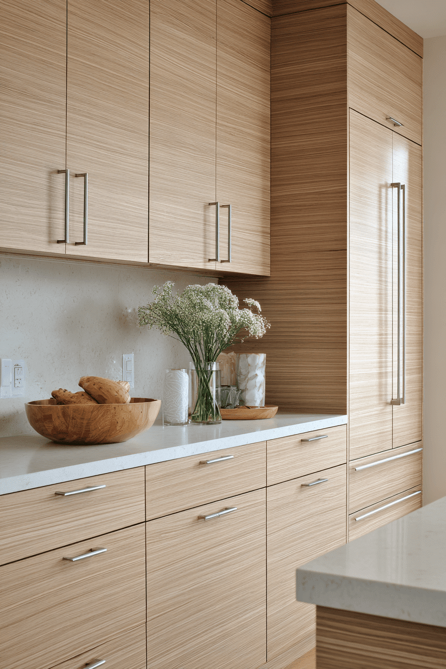 Horizontal grain alignment in hickory kitchen cabinets adds visual width and a unique design touch. It’s a small shift that makes a big impact in modern kitchens. The grain flows seamlessly across drawers and panels, creating a cohesive look. Pair with integrated handles or flat profiles for a streamlined feel. It’s perfect for open-concept layouts or minimalist homes. Tap to see how horizontal lines make waves!