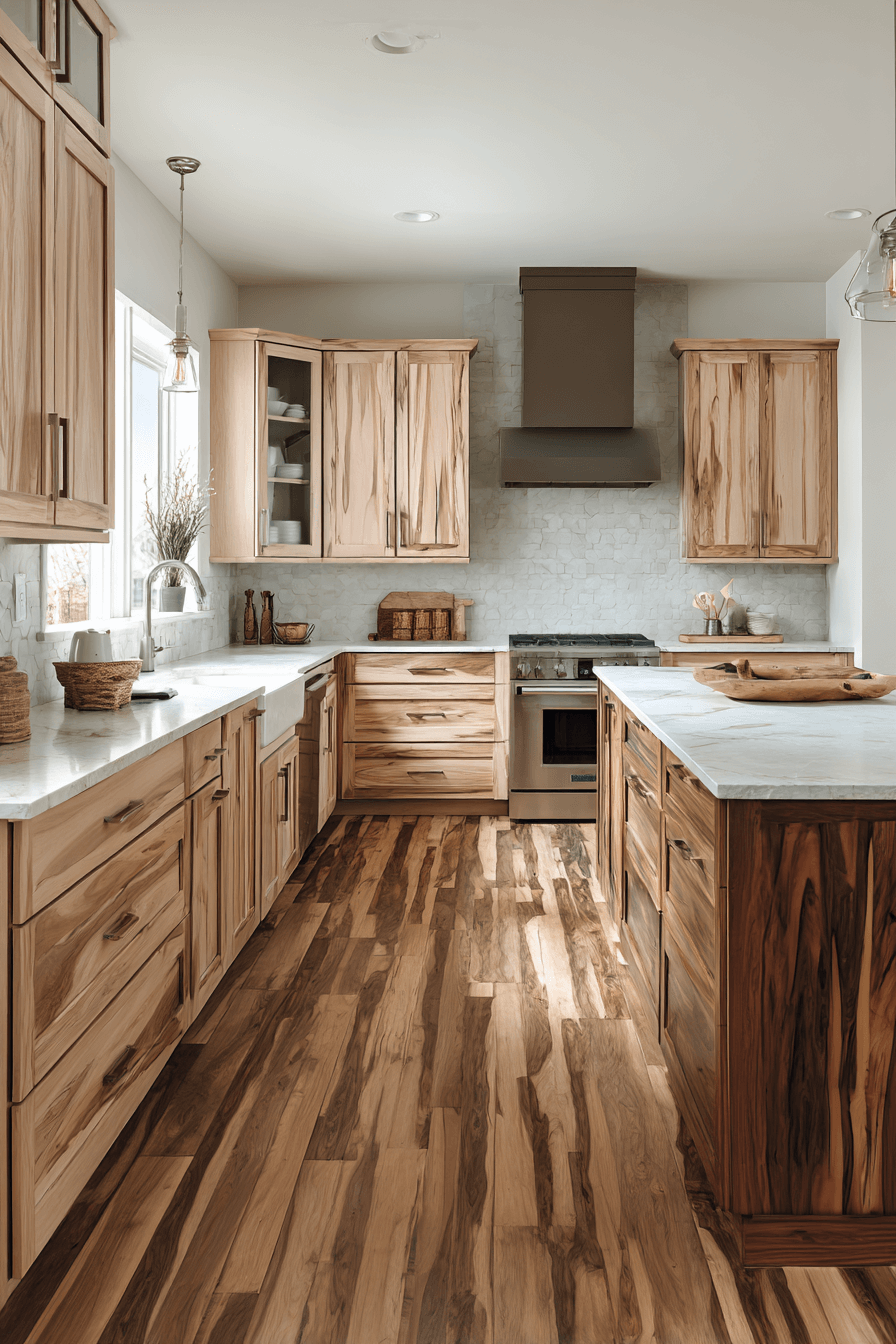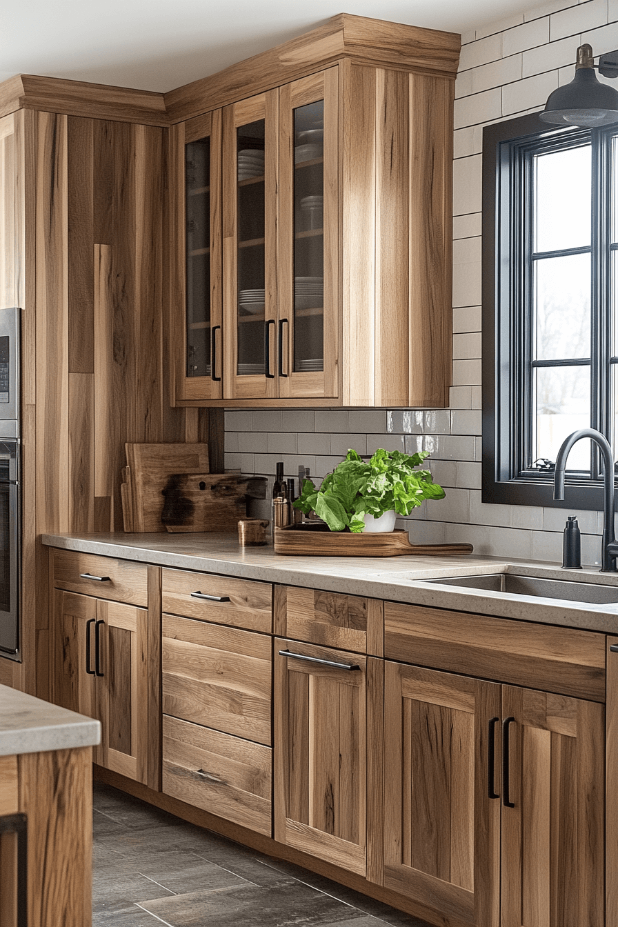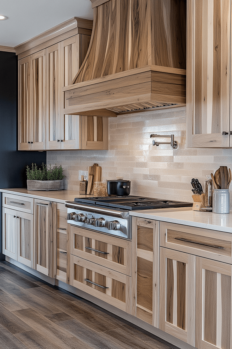 Mixing hickory with other wood tones creates a rich, layered aesthetic. Use hickory lowers and walnut or maple uppers for contrast. The grain play between the different woods keeps the eye engaged without overwhelming the space. It’s a designer move that adds depth and personality. This fusion of materials feels high-end and curated. Tap now for inspiring wood mix-and-match looks!