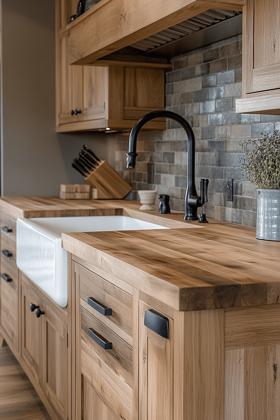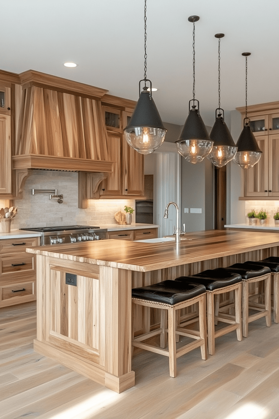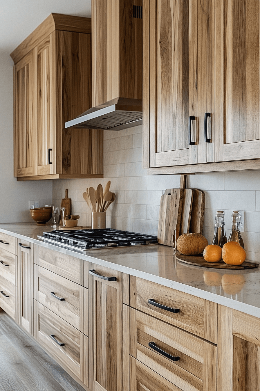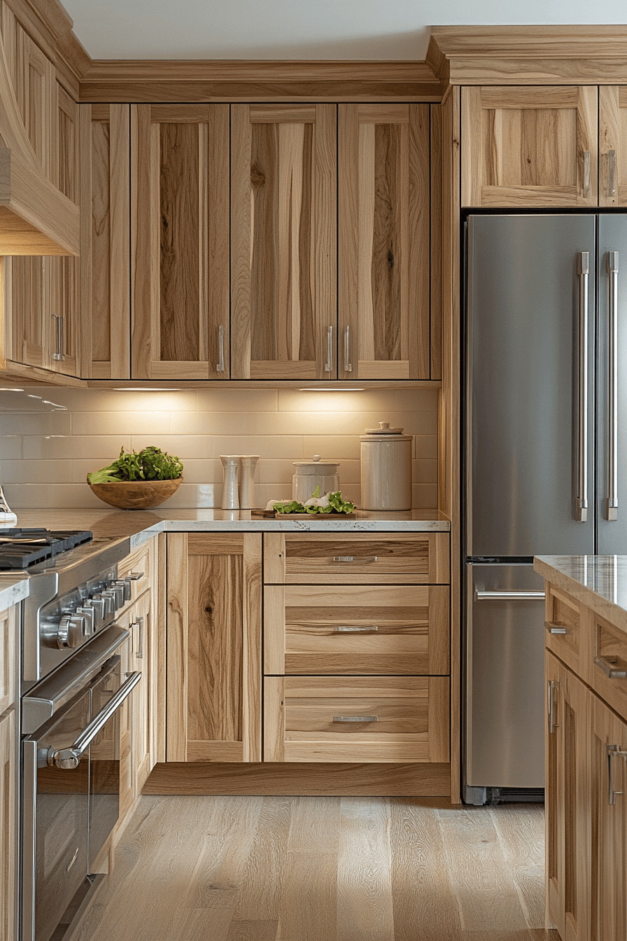 Mixing hickory with other wood tones creates a rich, layered aesthetic. Use hickory lowers and walnut or maple uppers for contrast. The grain play between the different woods keeps the eye engaged without overwhelming the space. It’s a designer move that adds depth and personality. This fusion of materials feels high-end and curated. Tap now for inspiring wood mix-and-match looks!
