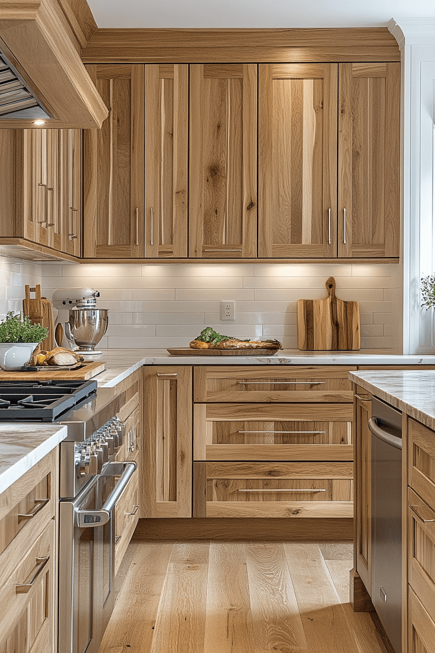 Natural hickory kitchen cabinets highlight the striking contrast between light and dark wood tones. The bold grain patterns create a vibrant, organic texture that adds depth to any kitchen. This look works beautifully with neutral countertops and matte finishes to keep the focus on the wood. Because hickory is so durable, it’s perfect for families and high-traffic spaces. These cabinets radiate warmth and rustic charm while still feeling modern. Tap to see how natural grain brings energy to your kitchen!
