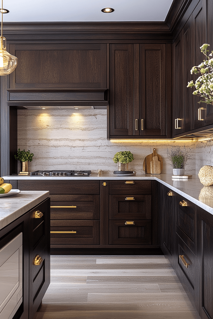 Dark-stained hickory kitchen cabinets bring drama and elegance while preserving the wood’s rich texture. This finish makes a bold statement, perfect for larger kitchens or open concepts. Pair with brass hardware or marble counters for a luxurious contrast. Despite the darker shade, the natural grain still shines through, adding depth. It’s a sophisticated update to rustic charm. Tap to see how dark hickory can elevate your space!