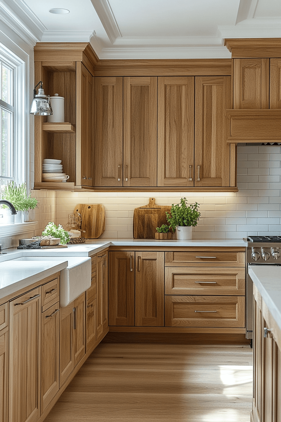 Light hickory kitchen cabinets brighten up the room while keeping the natural wood character alive. These cabinets work especially well in kitchens that need warmth without the heaviness of dark wood. The soft golden tone pairs beautifully with cream, gray, or white surfaces. It’s an ideal choice for modern farmhouse or Scandinavian-inspired homes. The subtle contrast in the grain adds movement without being overwhelming. Click to glow up your kitchen with light hickory!