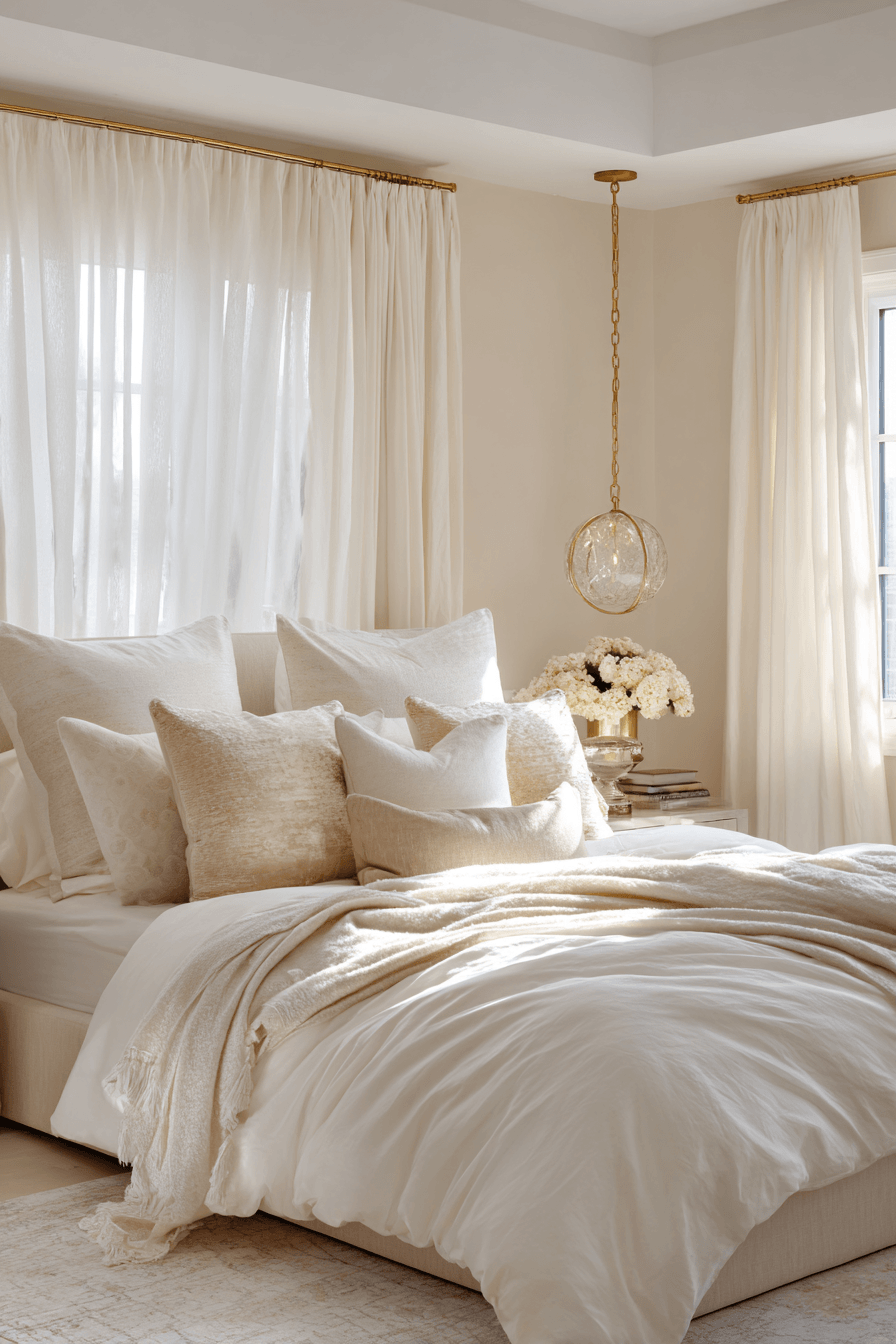 Cream and gold serenity creates a soft yet refined atmosphere in luxurious bedrooms through its elegant and timeless color pairing. Cream tones provide a light, airy foundation that instantly calms the space. Gold accents in lighting, decor, or hardware add a subtle touch of warmth and sophistication. Plush bedding, flowing drapery, and delicate textures enhance the cozy, inviting feel. Warm lighting complements the palette, creating a soft glow that feels both relaxing and upscale. The overall design is graceful, balanced, and effortlessly chic. Tap to explore this elegant palette!