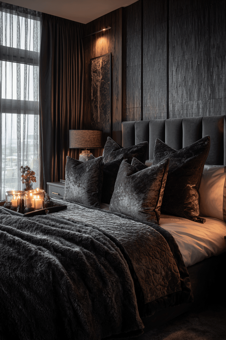 Dark moody luxury transforms luxurious bedrooms into rich, intimate spaces that feel like a private retreat. Deep tones such as charcoal, navy, espresso, and deep brown wrap the room in a cocoon-like atmosphere. Soft, layered lighting—like wall sconces, warm bedside lamps, and hidden LED accents—adds glow and dimension to the darker palette. Plush materials like velvet bedding, thick drapes, and textured rugs enhance the sense of depth and comfort. Metallic accents or subtle gloss finishes can add contrast and elevate the look even further. The result is bold, cozy, and undeniably sophisticated with a dramatic edge. Click to explore this dramatic style!