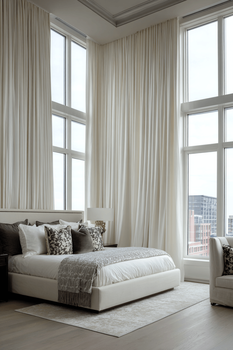 Floor to ceiling drapes instantly elevate luxurious bedrooms by adding dramatic height, softness, and movement to the space. Long, flowing fabrics draw the eye upward, making ceilings appear taller and rooms feel more expansive. Lightweight sheers create an airy feel, while heavier fabrics like velvet or linen add depth and elegance. Neutral tones keep the design cohesive, but bold colors can create a striking focal point. The drapes beautifully frame windows while also improving light control and privacy. The overall mood is graceful, airy, and sophisticated. Discover how to add this dramatic detail!