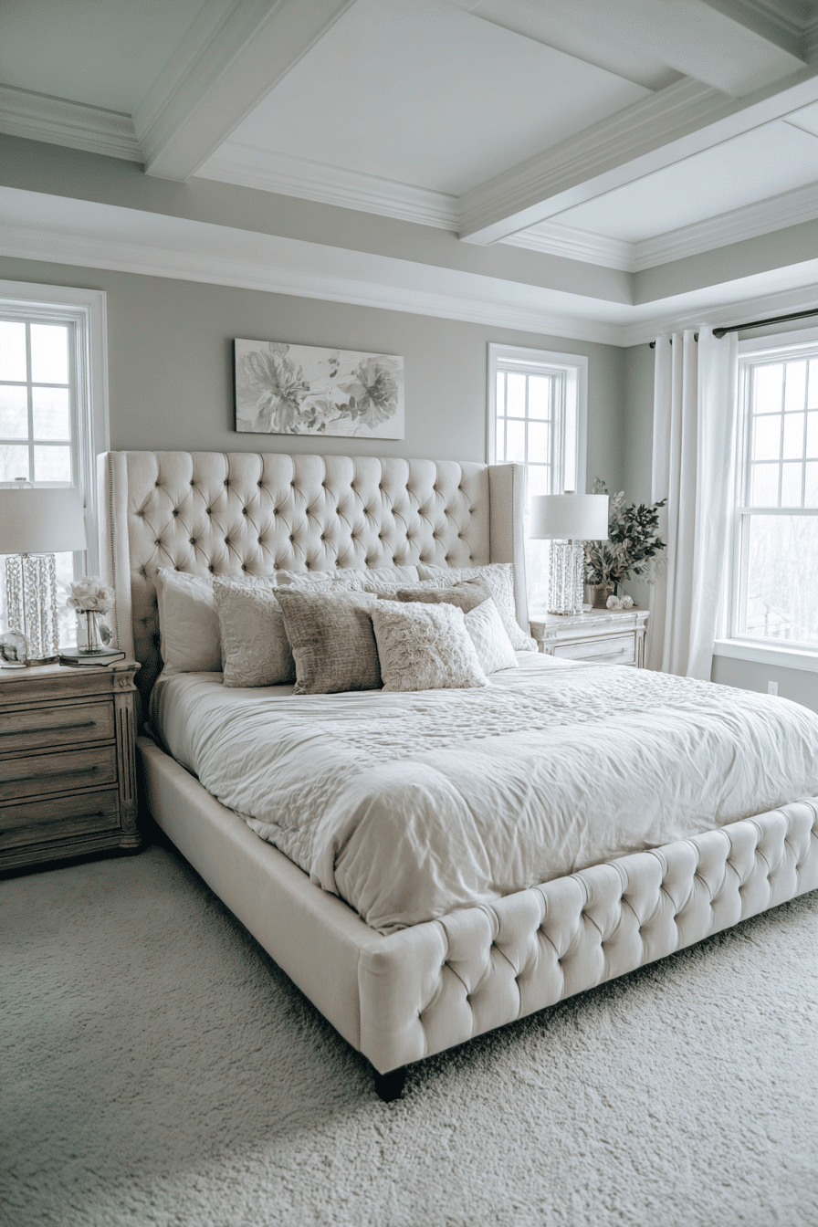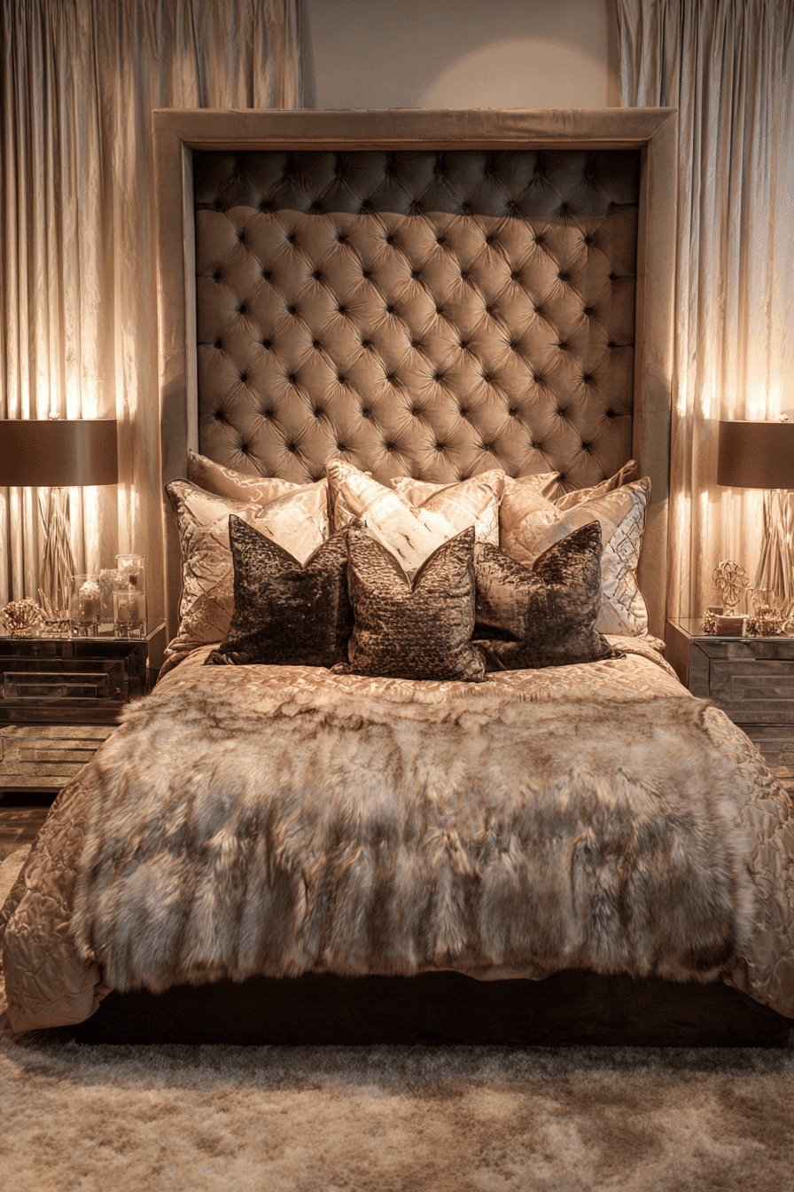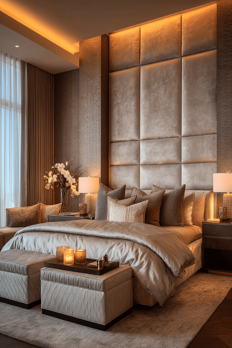 A statement headboard luxe design defines luxurious bedrooms by transforming the bed into a bold and captivating focal point. Oversized headboards in velvet, leather, or textured fabrics add height, drama, and visual impact. Deep tufting, channel stitching, or curved silhouettes enhance the luxurious feel even further. The surrounding decor is kept minimal to allow the headboard to stand out as the centerpiece. Soft lighting highlights the textures and creates a warm, inviting glow. This approach instantly elevates the entire room with minimal effort. Tap to see how to make your bed the centerpiece!
