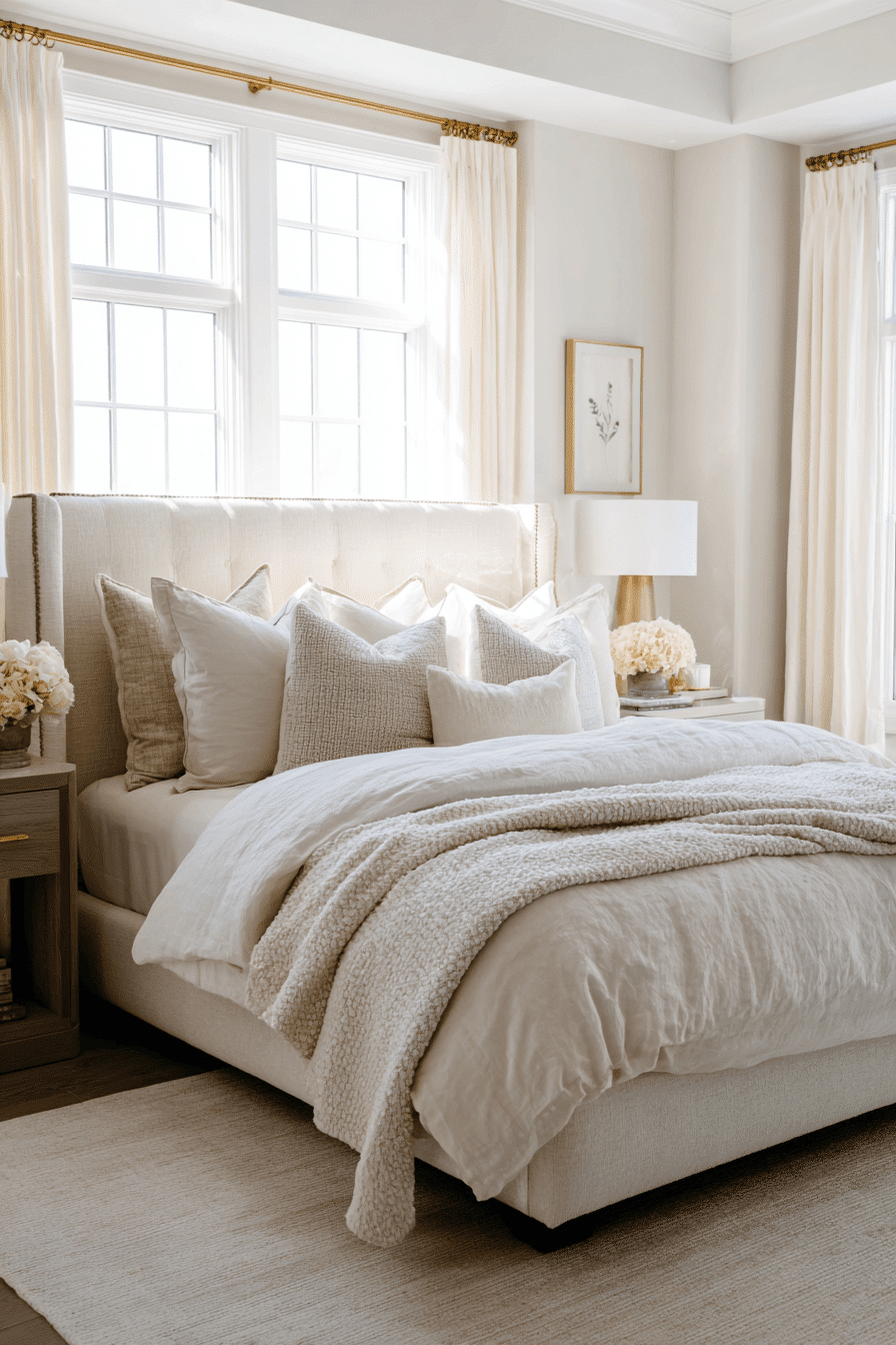 A soft neutral luxe suite creates one of the most inviting luxurious bedrooms by layering warm tones like beige, cream, ivory, and soft taupe for a seamless, calming palette. These gentle hues reflect natural light beautifully, making the space feel larger, brighter, and more open. Plush bedding, oversized upholstered headboards, and flowing drapery add dimension and softness. Rich materials like linen, boucle, cashmere throws, and light wood finishes introduce texture without disrupting the harmony. Subtle metallic accents or warm lighting elevate the look with a touch of understated glamour. The overall mood is tranquil, cozy, and effortlessly sophisticated. Click to explore this soothing color palette!