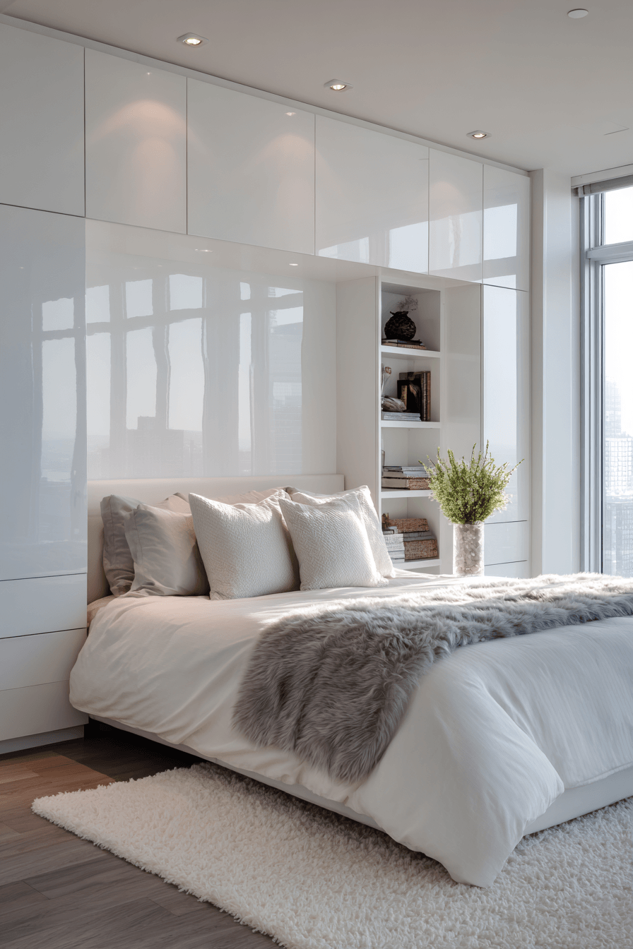 A high gloss glam room adds shine and sophistication to luxurious bedrooms with its sleek, reflective surfaces and polished finishes. Glossy cabinetry, lacquered furniture, and mirrored accents create a luminous effect that enhances light throughout the space. Metallic details in chrome, gold, or silver add an extra layer of glamour. Soft fabrics like velvet or faux fur balance the shine, bringing warmth and comfort into the design. Strategic lighting amplifies the reflective surfaces, making the room feel bright and expansive. The result is bold, glamorous, and undeniably modern. Discover how to add shine to your space!