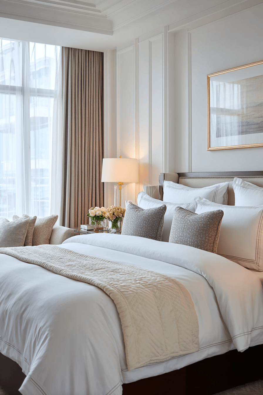 A hotel inspired bedroom transforms everyday living into one of the most polished luxurious bedrooms with its crisp styling and perfectly balanced layout. Fresh white linens layered with plush duvets and multiple pillows create that signature five-star feel. Symmetry plays a key role, with matching nightstands, lamps, and decor adding a sense of order and calm. Soft ambient lighting, blackout curtains, and neutral tones enhance the restful atmosphere. High-quality finishes, from upholstered benches to sleek furniture, elevate the entire space. The result is a room that feels indulgent, organized, and designed for total relaxation. Discover how to bring hotel luxury home!