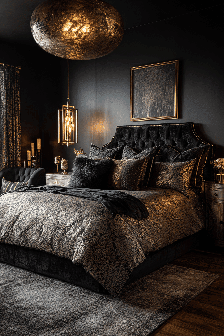 Black and gold elegance creates a bold and dramatic statement in luxurious bedrooms with its striking contrast and rich finishes. Deep black walls or furniture provide a moody, sophisticated backdrop that feels instantly upscale. Gold accents in lighting, hardware, or decor add warmth and a glamorous glow. Luxurious materials like velvet, silk, and glossy surfaces enhance the opulent feel of the space. Strategic lighting highlights textures and metallic details, creating depth and visual drama. The overall effect is daring, refined, and undeniably chic. Click to explore this striking combination!