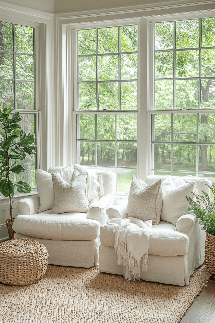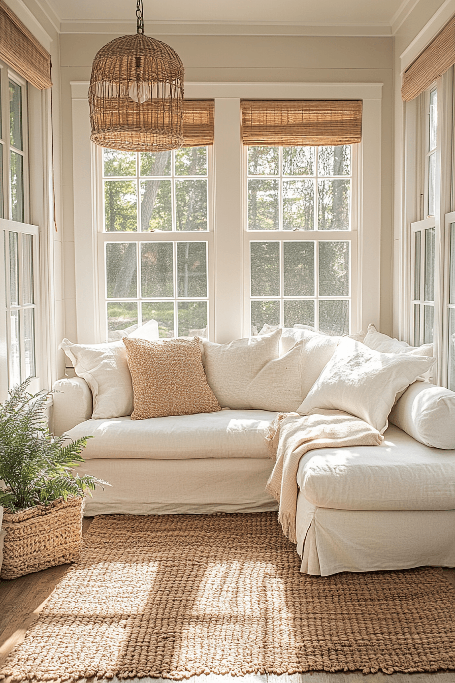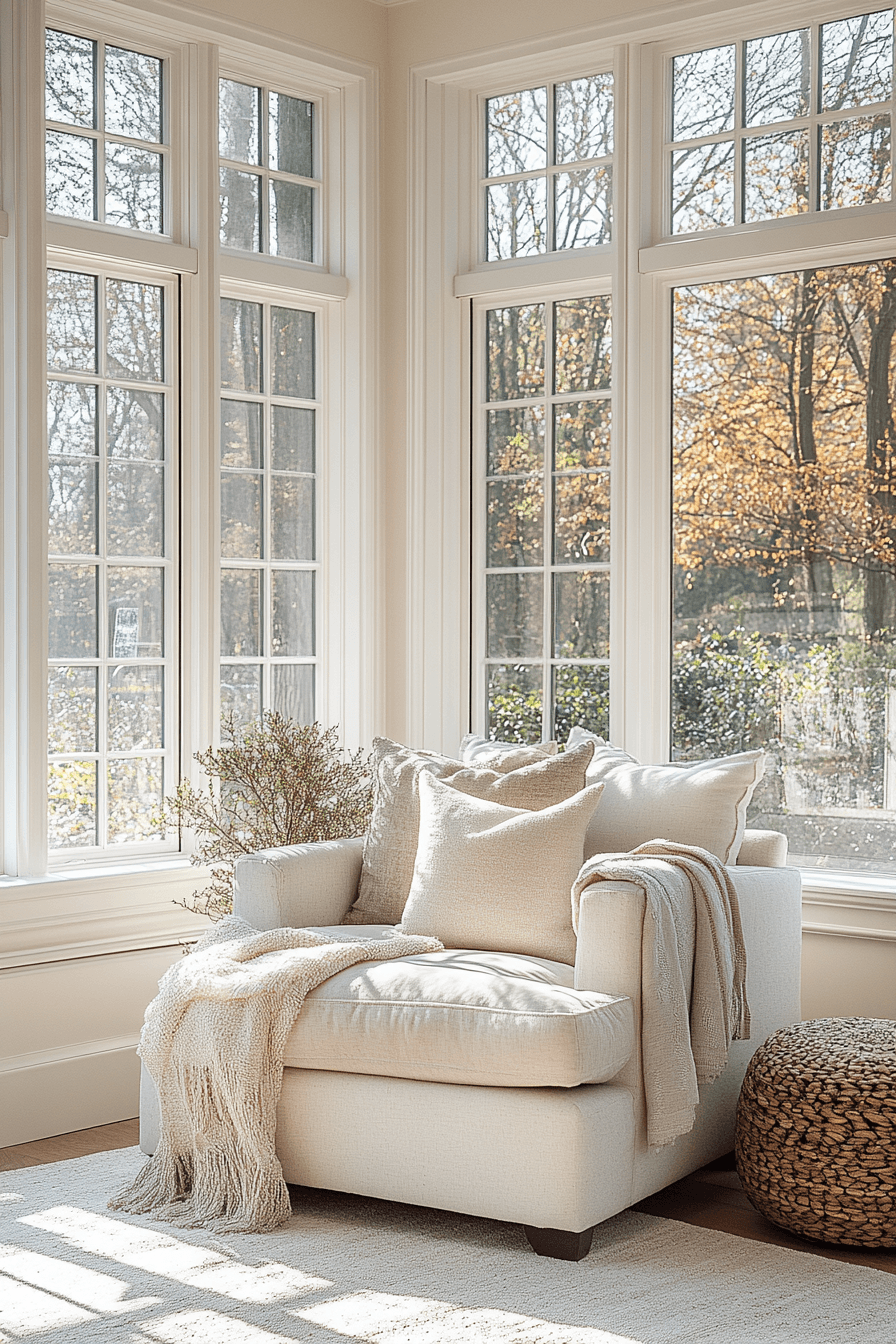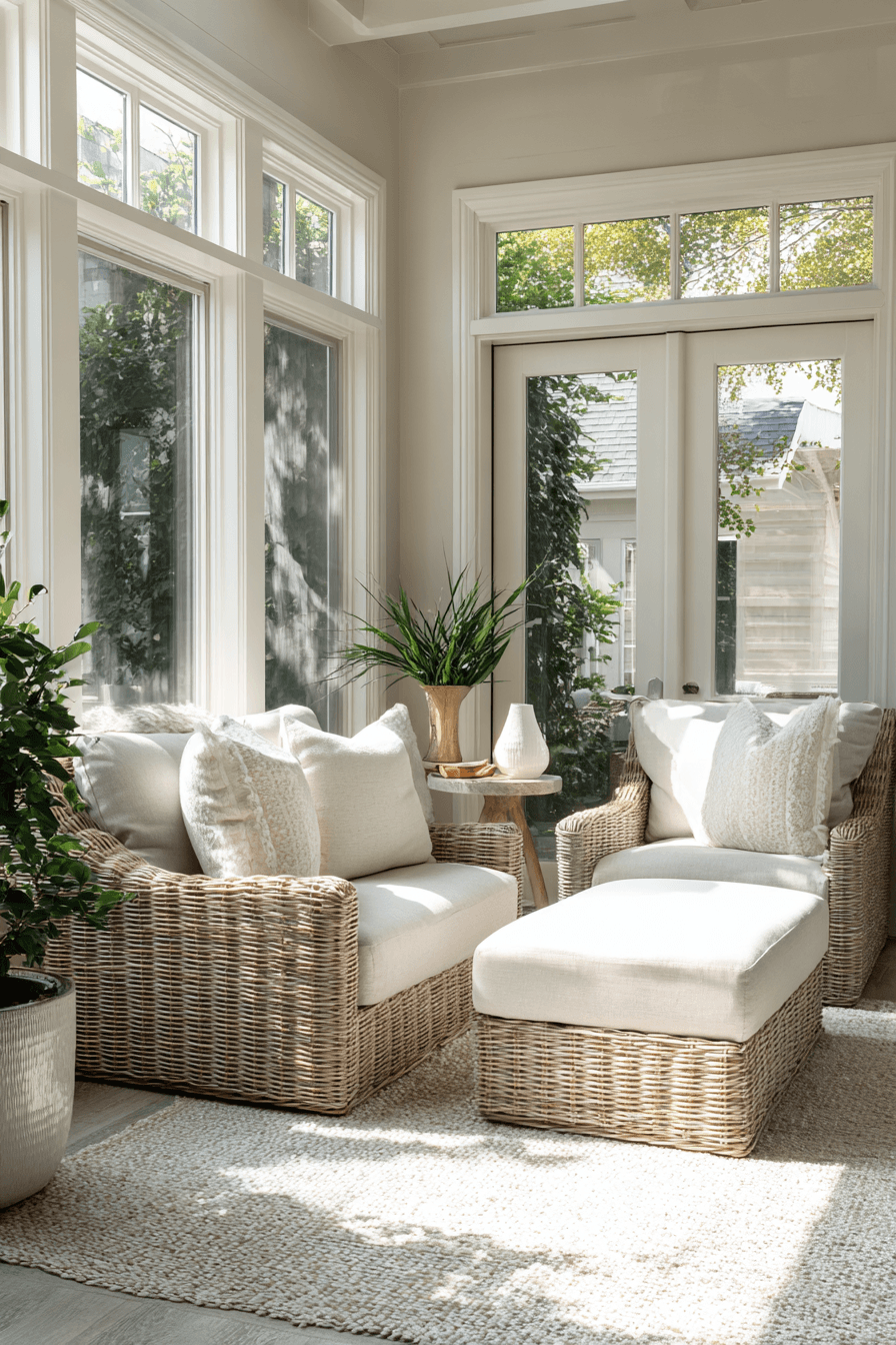 A soft, calming palette enhances the light that fills this cozy corner, creating a serene and cohesive environment. Neutral shades like beige, cream, and soft grey keep the space visually quiet and relaxing. Minimal decor ensures the room feels uncluttered, while natural textures add gentle depth and interest. Small sunroom ideas benefit from this kind of subtle, layered approach. Adding a soft throw or woven accent can bring extra warmth without disrupting the calm. The overall vibe is soothing, elegant, and effortlessly stylish. Click to explore this calm retreat.