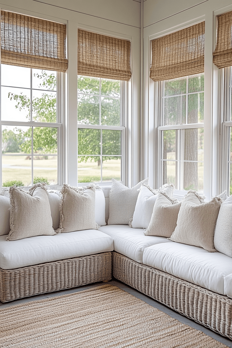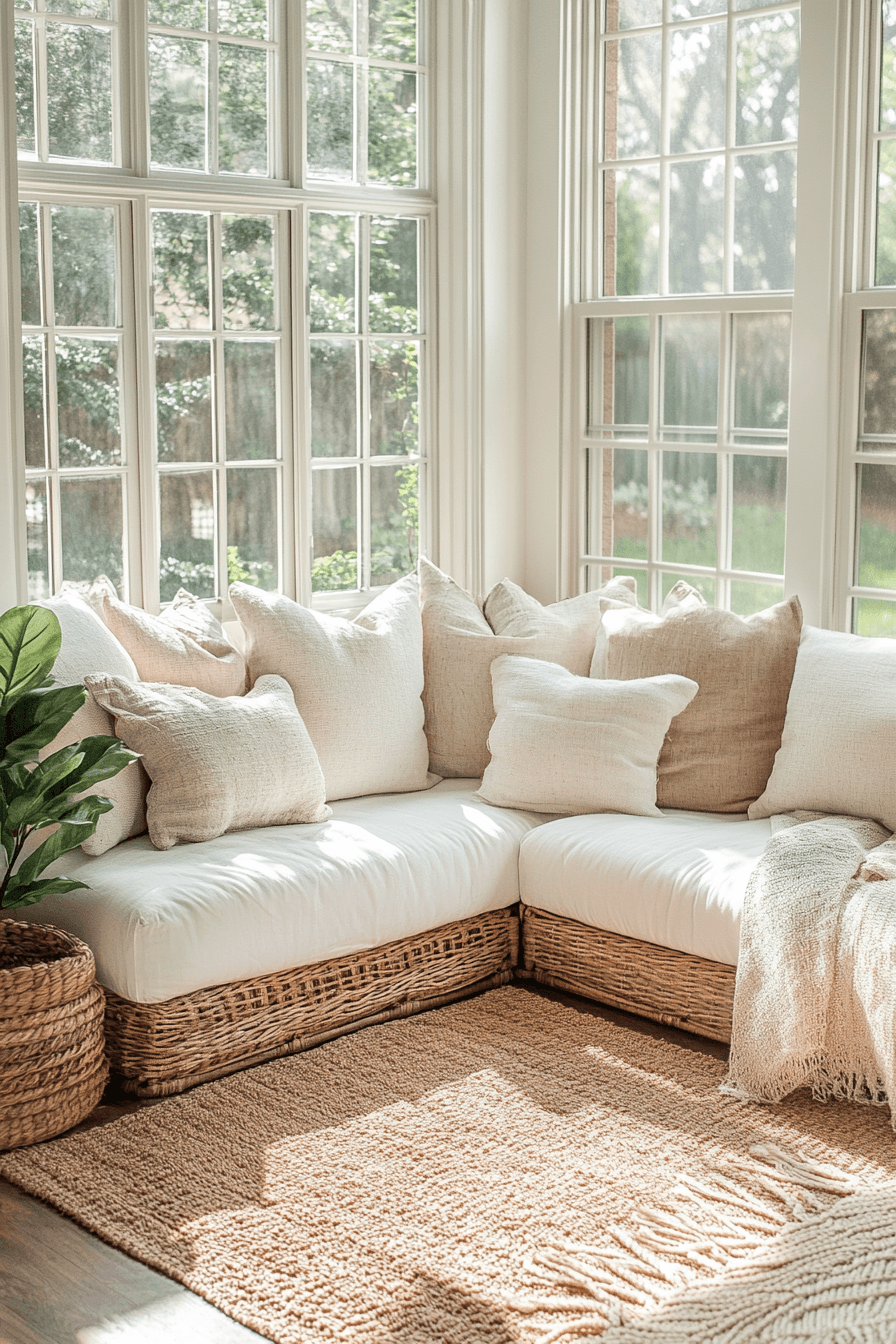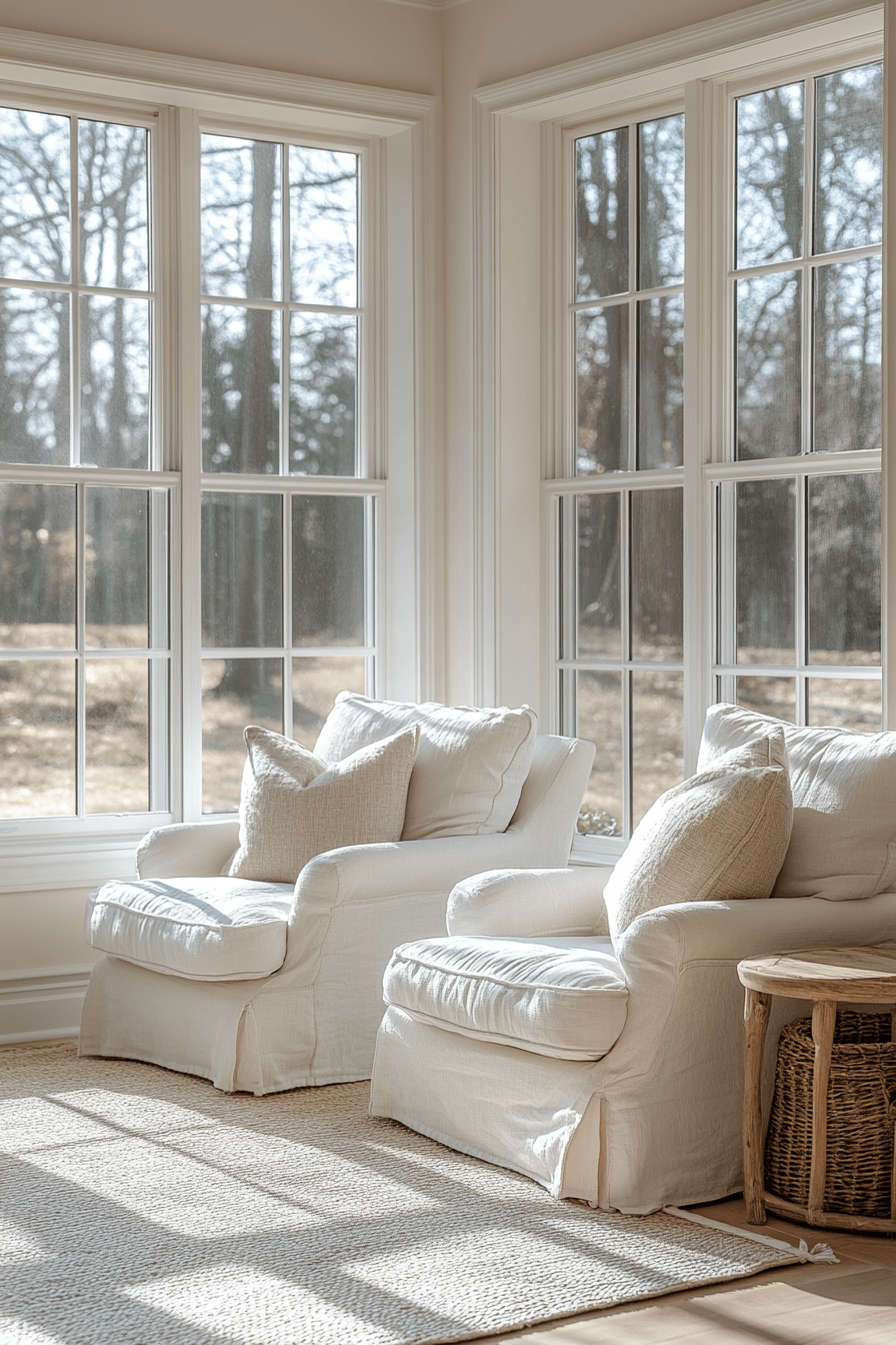 A soft, calming palette enhances the light that fills this cozy corner, creating a serene and cohesive environment. Neutral shades like beige, cream, and soft grey keep the space visually quiet and relaxing. Minimal decor ensures the room feels uncluttered, while natural textures add gentle depth and interest. Small sunroom ideas benefit from this kind of subtle, layered approach. Adding a soft throw or woven accent can bring extra warmth without disrupting the calm. The overall vibe is soothing, elegant, and effortlessly stylish. Click to explore this calm retreat.