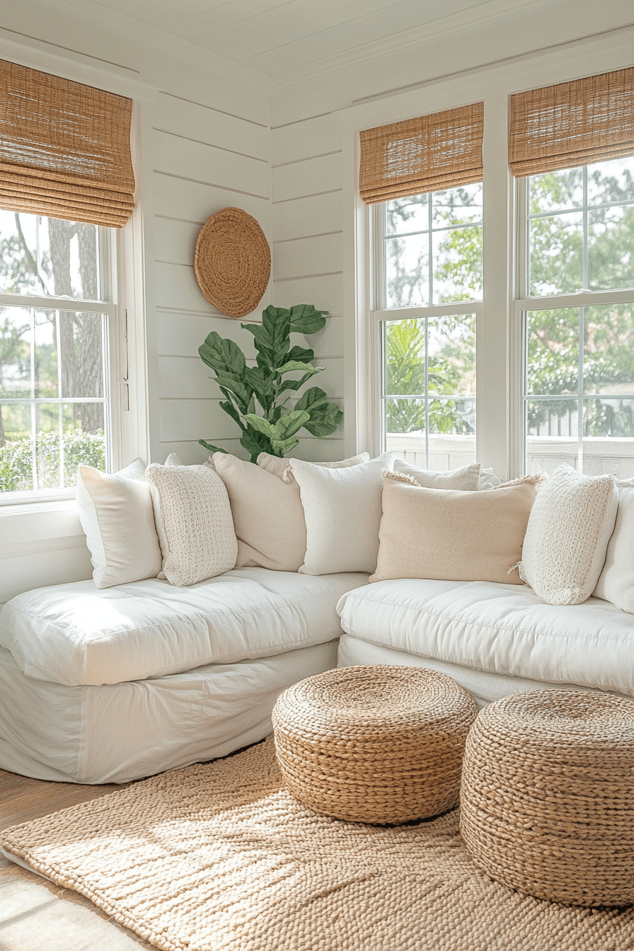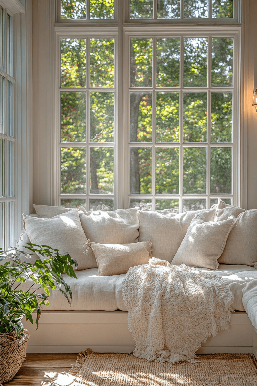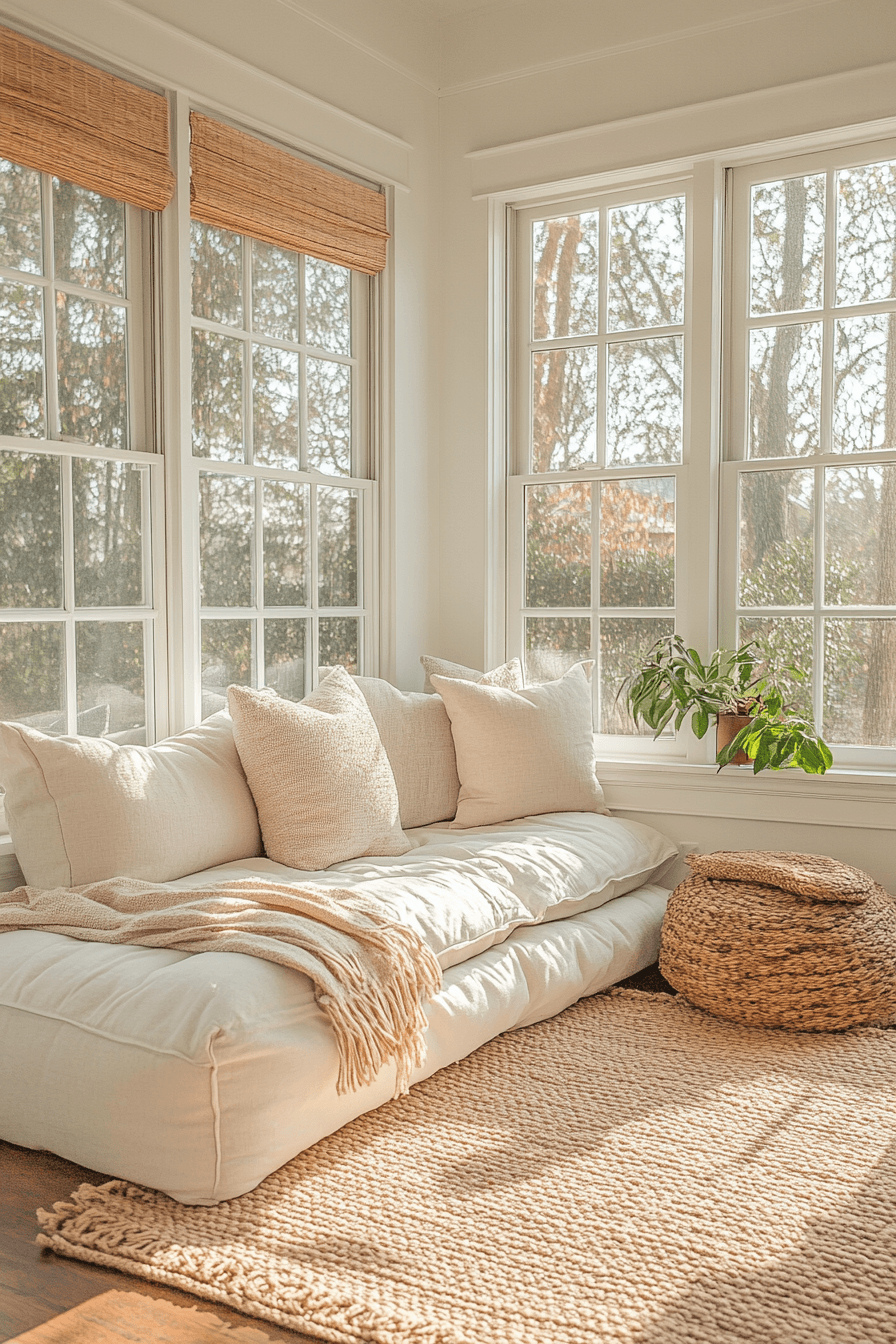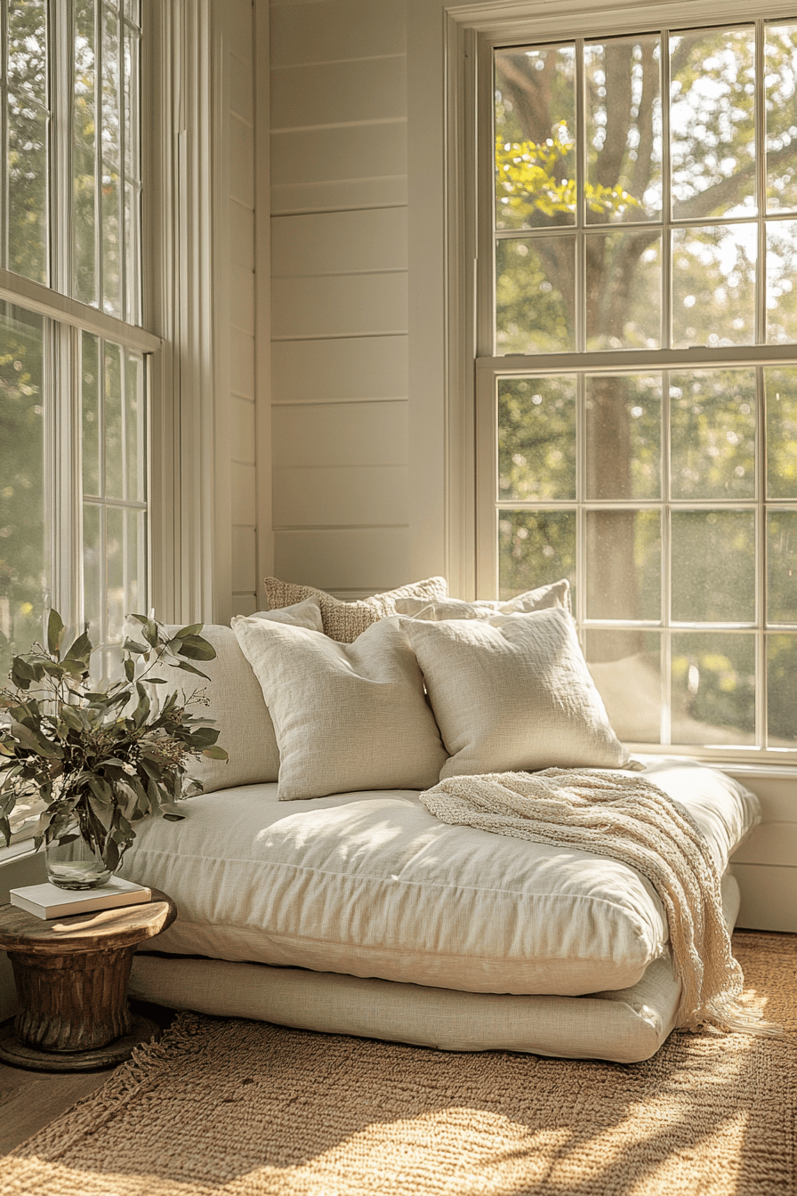 A soft, calming palette enhances the light that fills this cozy corner, creating a serene and cohesive environment. Neutral shades like beige, cream, and soft grey keep the space visually quiet and relaxing. Minimal decor ensures the room feels uncluttered, while natural textures add gentle depth and interest. Small sunroom ideas benefit from this kind of subtle, layered approach. Adding a soft throw or woven accent can bring extra warmth without disrupting the calm. The overall vibe is soothing, elegant, and effortlessly stylish. Click to explore this calm retreat.