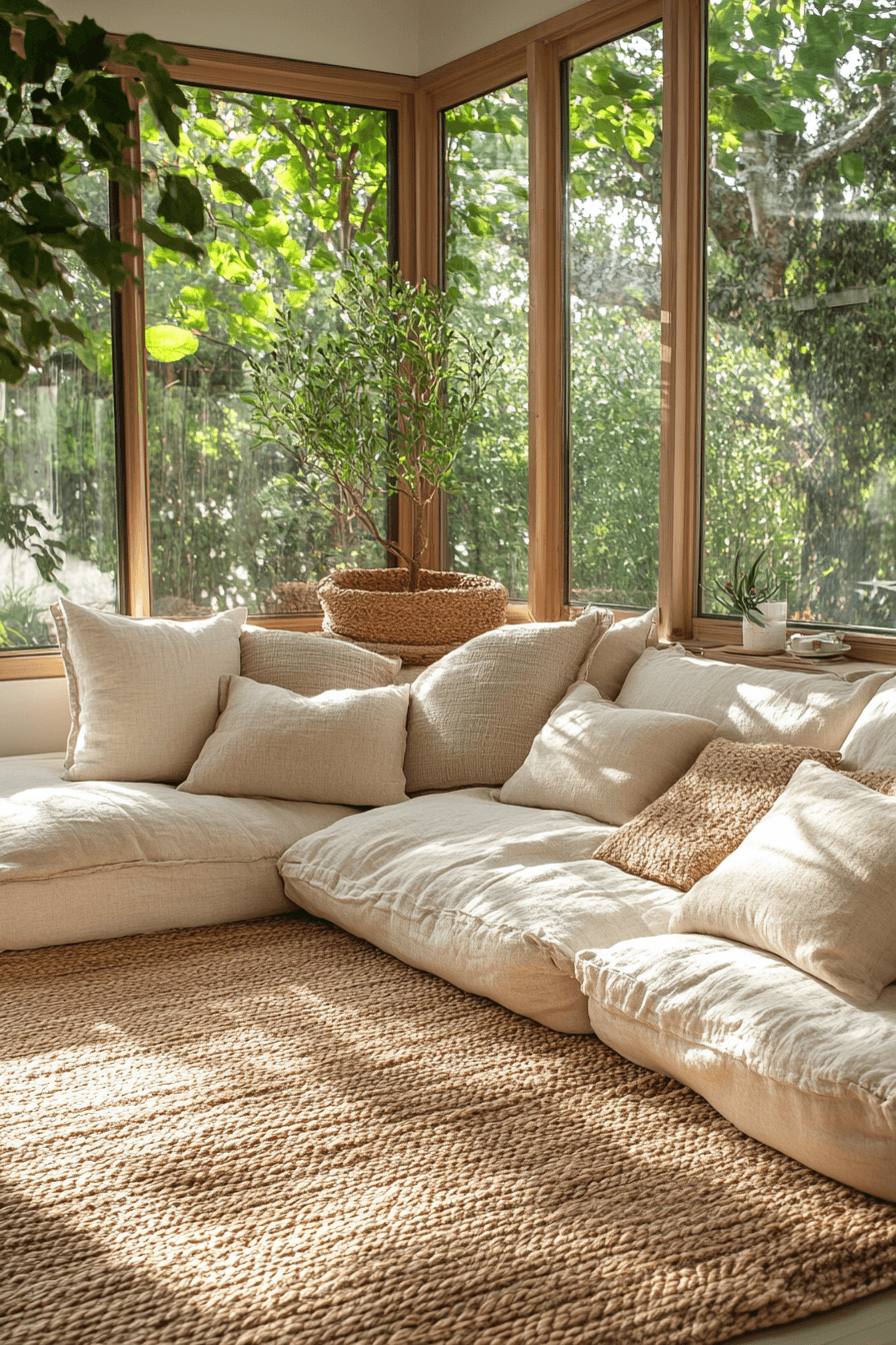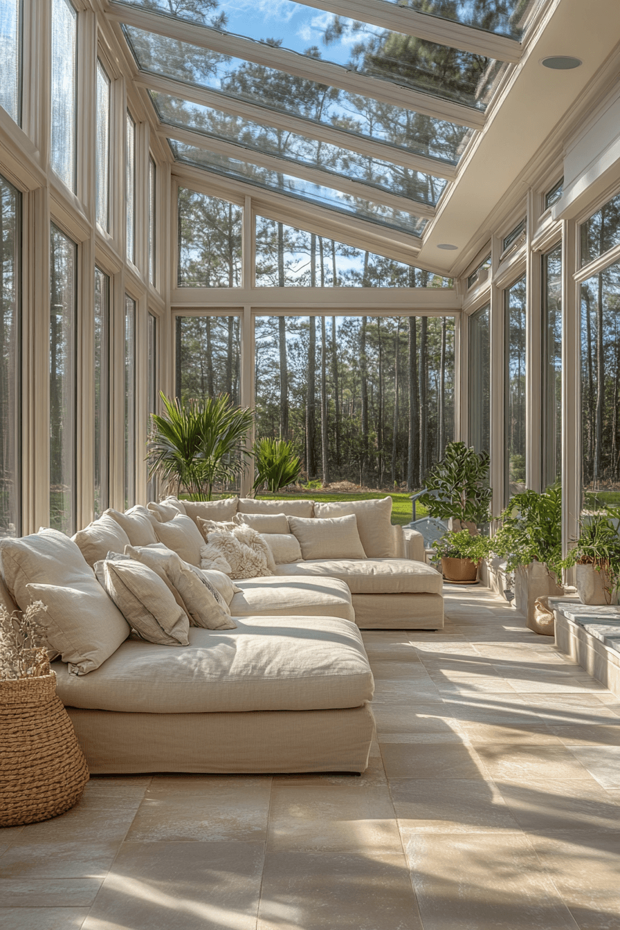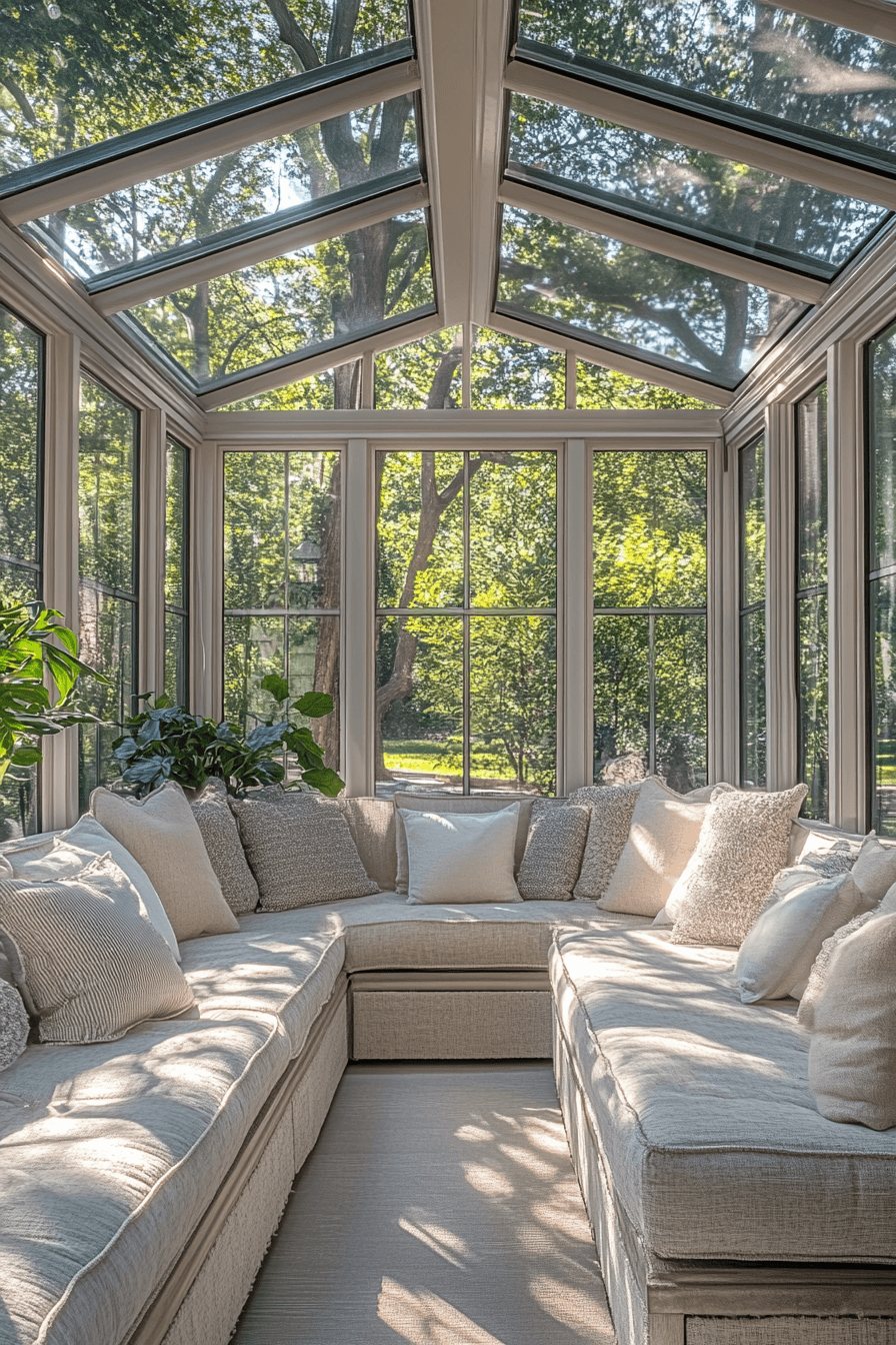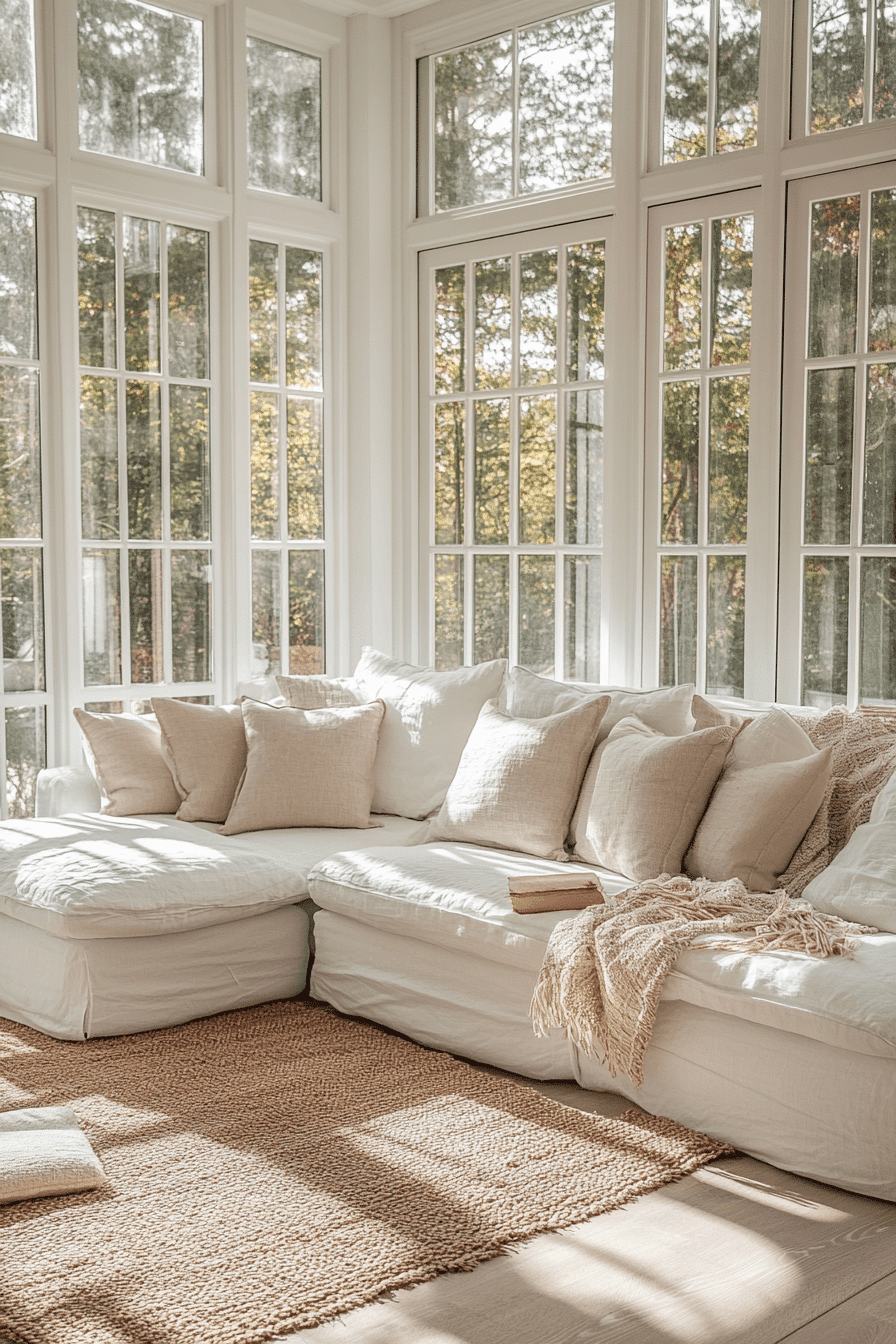 Large windows turn this space into a sun-filled escape that feels both cozy and elevated at the same time. Clean-lined seating keeps the look modern while maximizing comfort for lounging or reading. Light fabrics like linen or cotton help diffuse the sunlight, creating a soft and inviting glow throughout the room. Small sunroom ideas like this focus on balancing comfort with simplicity and natural light. Adding a small side table or layered cushions can enhance usability without clutter. The result is a relaxing nook that feels spacious and thoughtfully designed. Tap to discover this peaceful design.