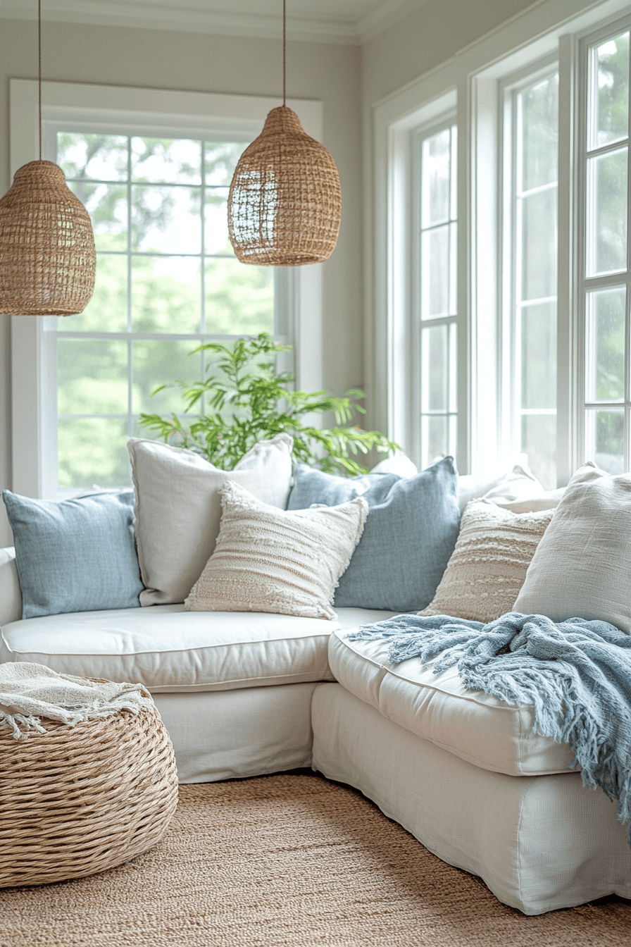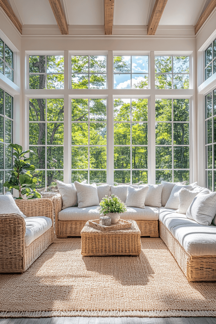 This design leans into coastal tones, creating a soft and breezy atmosphere that feels like a getaway at home. Light wood accents, airy fabrics, and soft blues or sandy neutrals keep the space feeling relaxed and cohesive. Sunlight filters through gently, adding warmth without overpowering the palette. Small sunroom ideas like this are perfect for creating a vacation-inspired vibe in a compact space. Adding woven textures or subtle decor can enhance the coastal feel. The space feels calm, open, and effortlessly stylish. Click to see this coastal charm.