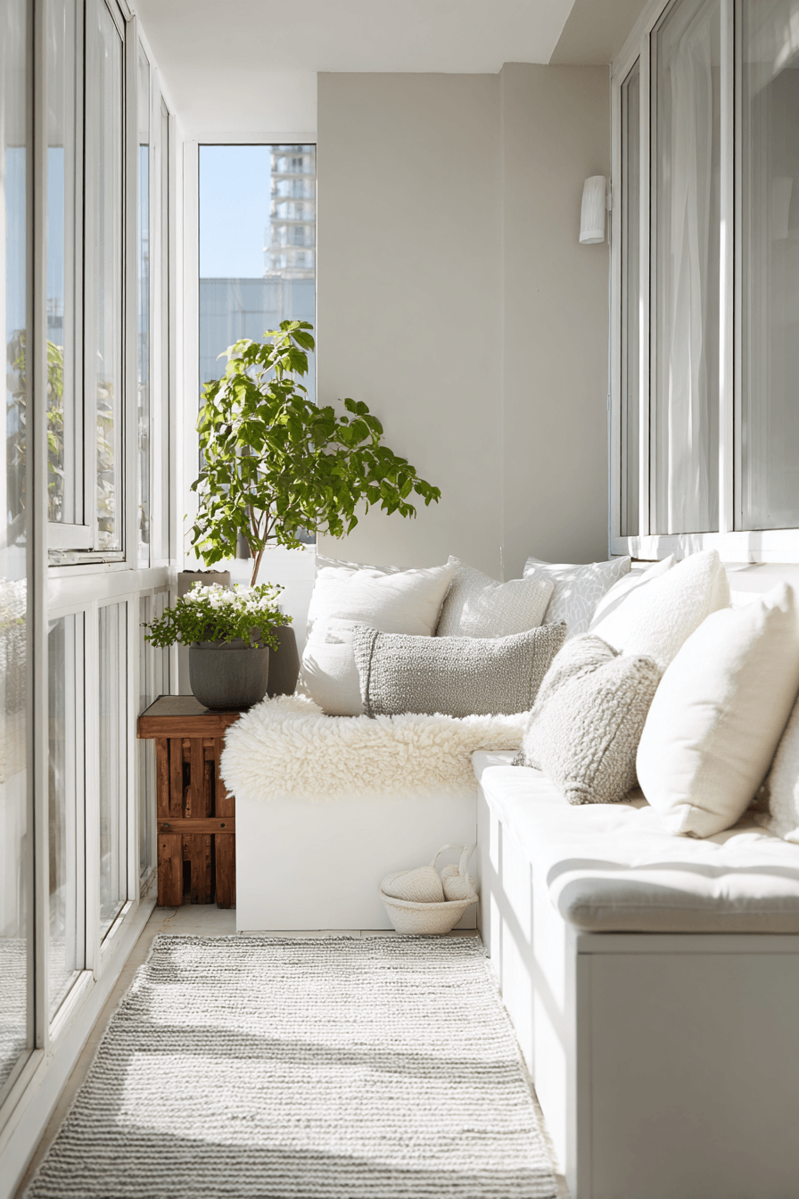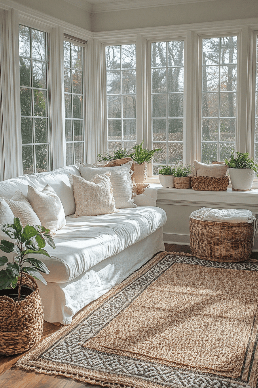 Bright sunlight fills this corner, making it feel lively, energizing, and instantly welcoming throughout the day. Compact furniture like a slim loveseat or small accent chairs ensures the space remains open, functional, and easy to move through. Light fabrics such as linen or cotton soften the overall look while keeping the atmosphere airy and comfortable. Small sunroom ideas benefit from this kind of brightness and openness, allowing natural light to take center stage. Adding a simple side table or a light rug can enhance usability without adding clutter. The mood is cheerful, clean, and effortlessly uplifting. Tap to get inspired by this radiant space.