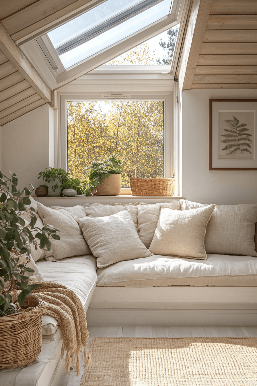 A skylight effect enhances the brightness, making this nook feel uplifting, fresh, and full of energy throughout the day. Compact seating fits perfectly without blocking any natural light sources, keeping the space open and functional. Pale finishes like white, cream, or light wood reflect sunlight beautifully, helping the room feel more expansive. Small sunroom ideas like this show how maximizing light can completely transform even the smallest areas. Adding a soft throw or light cushion can bring comfort without reducing openness. The overall look is clean, cheerful, and welcoming. Tap to bring this look home.