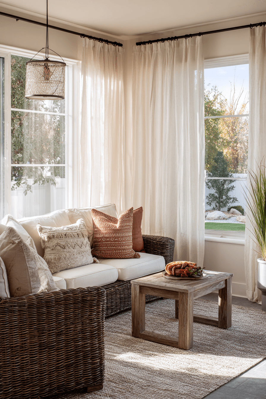 Warm tones and sunlight combine to create a cozy yet open retreat that feels welcoming from the moment you step in. The furniture is thoughtfully arranged to maximize both comfort and easy movement within the space. Gentle lighting and natural sunlight highlight textures like wood, fabric, and woven elements without overpowering the design. Small sunroom ideas thrive in spaces that balance warmth with openness. Adding soft textiles or layered accents can enhance the inviting feel. The overall mood is comforting, relaxed, and softly refined. Tap to see how this warmth comes together.