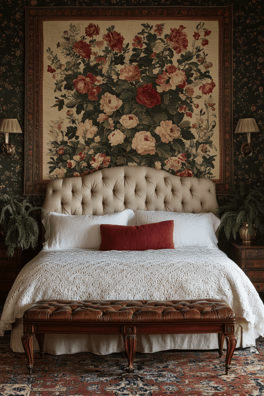 Floral tapestry walls bring softness and storytelling into an antique bedroom with their rich woven textures and intricate botanical scenes. These wall hangings instantly create depth while adding a sense of heritage and artistry. The layered fabrics complement carved wood furniture and vintage brass lighting beautifully. Their muted, timeworn tones help the room feel warm and collected rather than overly ornate. Whether hung behind the bed or across a full accent wall, they create a dramatic yet cozy backdrop. Tap to wrap your antique bedroom in timeless floral charm!