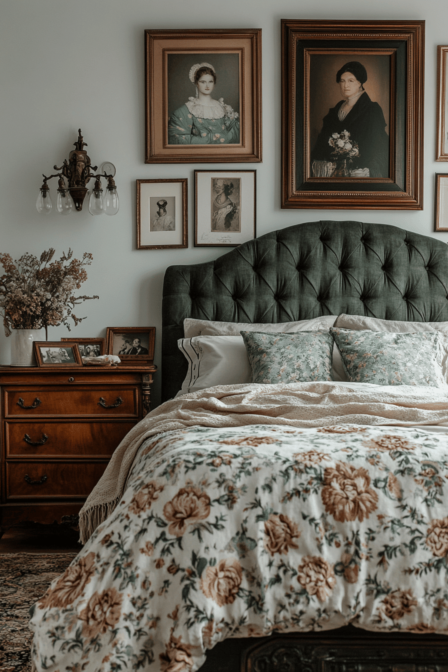 Portrait gallery bedrooms transform blank walls into curated storytelling spaces within an antique bedroom design. Framed oil paintings, sepia photographs, and gilded miniatures add personality and historic depth. Arranged symmetrically or in a collected-over-time layout, they enhance the architectural elegance of the room. The artwork pairs beautifully with velvet drapes and classic chandeliers. This gallery approach turns the bedroom into a refined personal sanctuary. Click to curate your own antique bedroom gallery wall!