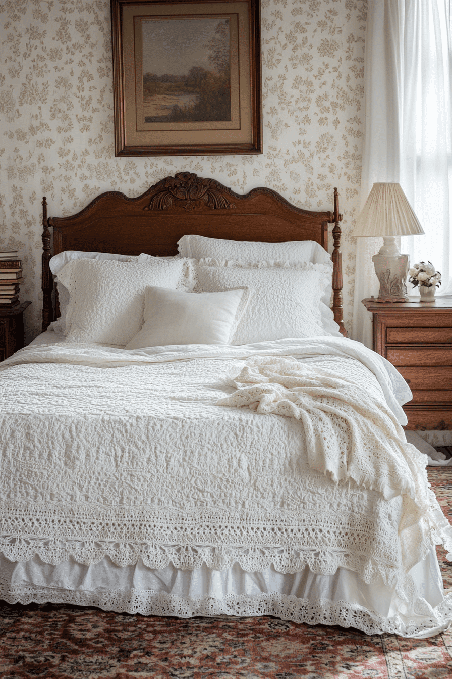 Layered lace bedding creates a romantic and delicate atmosphere that defines a truly beautiful antique bedroom. Intricate lace trims, crochet details, and embroidered linens add softness and dimension. These textiles look stunning when paired with iron bedframes or carved wood headboards. The subtle textures bring warmth without overpowering the overall design. Combined with neutral or faded pastel palettes, they create a serene retreat. Tap to dress your antique bedroom in graceful vintage layers!