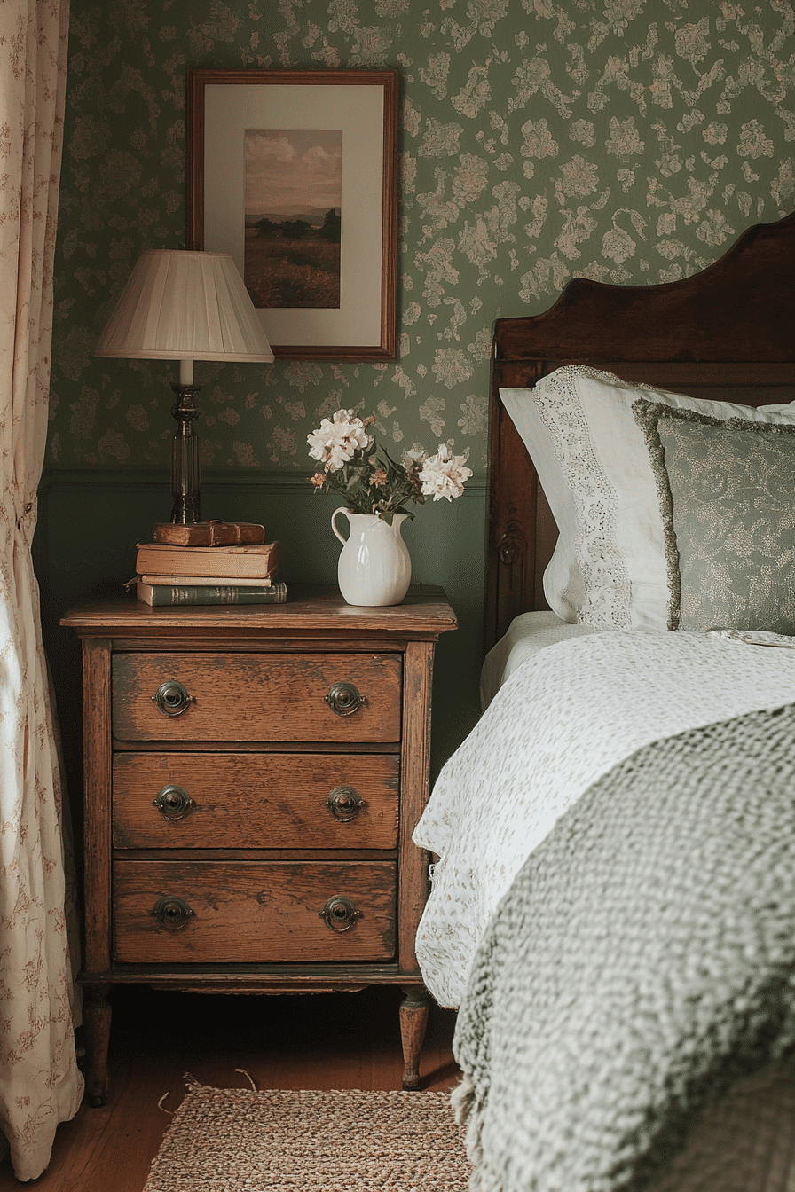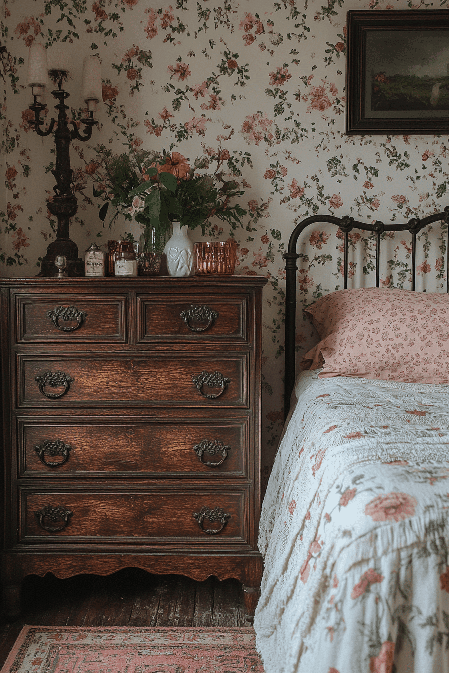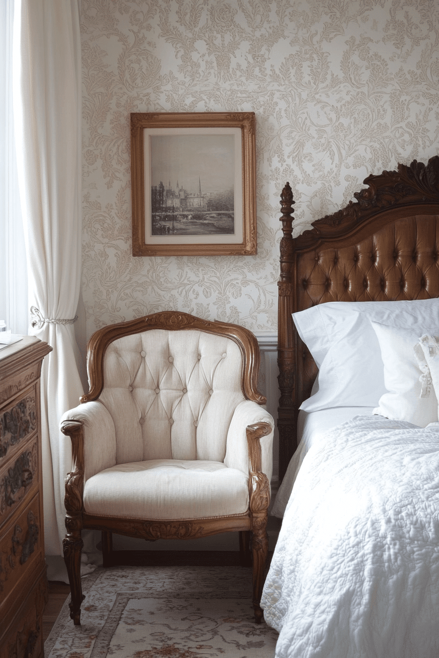 Victorian wallpaper revival brings intricate florals and damask patterns back into the heart of an antique bedroom. These detailed prints instantly add depth and character to the walls. Paired with carved headboards and brass accents, the effect feels immersive and richly layered. The vintage patterns create a backdrop that highlights classic furnishings and textiles. This revival balances drama and elegance in a refined way. Click to transform your antique bedroom with heritage-inspired wallpaper!