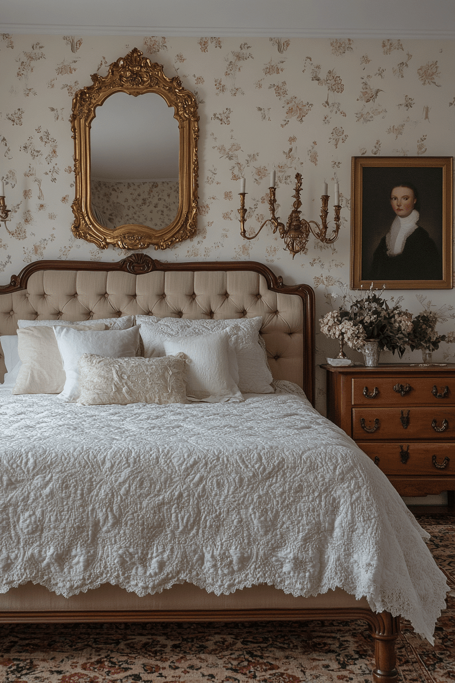 Gilded mirror backdrops add a regal touch to antique bedrooms, reflecting light and amplifying vintage elegance. Their ornate frames and aged gold finishes bring sophistication and shine to otherwise muted palettes. Hung above a bed or dresser, they make a bold yet refined statement. These mirrors pair well with crystal chandeliers, velvet fabrics, and carved wood accents. The interplay of reflection and gilding enhances the layered beauty of antique interiors. Tap to add some golden glow to your antique bedroom today!