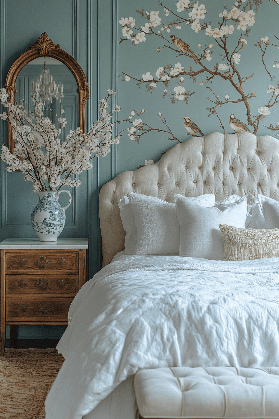 Chinoiserie accent walls elevate an antique bedroom with hand-painted elegance and worldly flair. These intricate designs often feature birds, florals, and landscapes in soft, muted palettes. Whether wallpapered or painted, they make a striking backdrop for vintage furnishings. Paired with bamboo-framed mirrors or lacquered furniture, they add an artistic, collected feel. The delicate patterns bring a serene yet sophisticated vibe to the space. Tap to introduce this timeless motif into your antique bedroom!