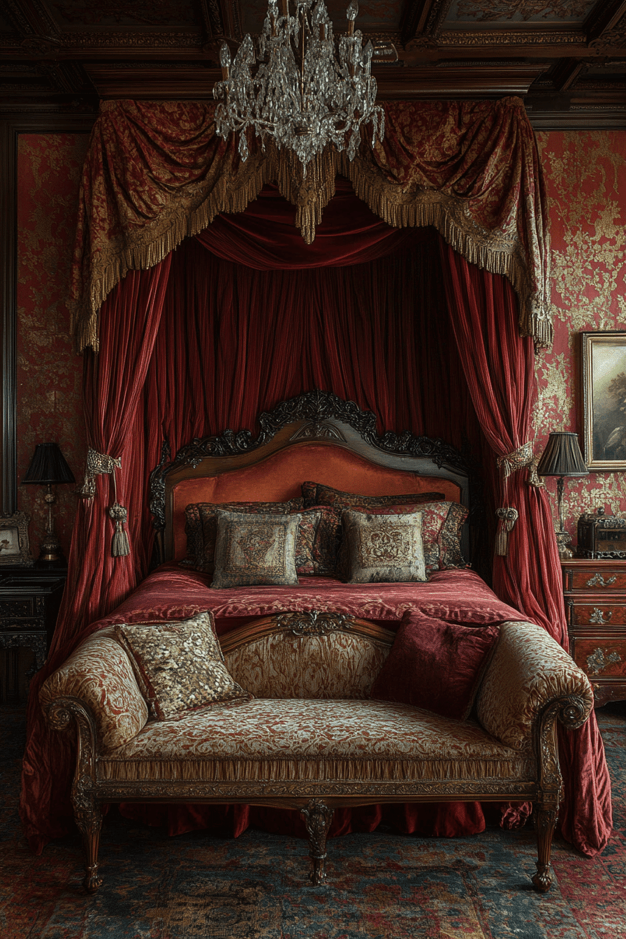 Baroque-inspired canopies transform an antique bedroom into a luxurious retreat with their theatrical flair and ornate fabric draping. Featuring carved posts, tassels, and rich textiles, they evoke the elegance of royal chambers. These canopies work best with tall ceilings and dramatic decor accents like gilded frames or heavy curtains. Paired with tufted bedding and damask prints, the result feels regal and inviting. The structured grandeur adds vertical interest and architectural drama. Tap to crown your bed with antique opulence!