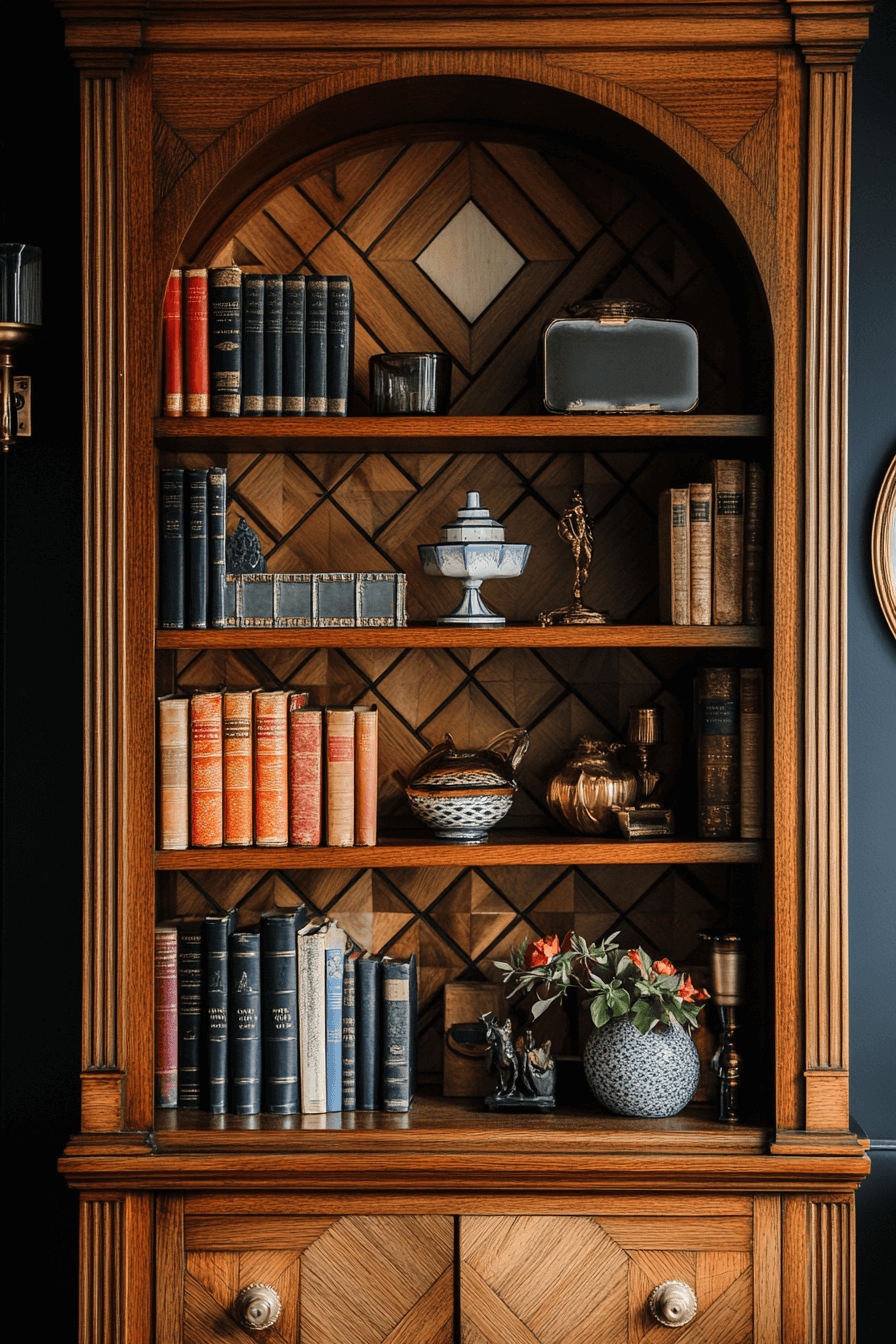 An Art Deco-inspired bookshelf adds streamlined elegance and vintage glamour to an antique bookshelf mix. Think symmetrical lines, geometric inlays, and dark lacquered wood that reflects light in all the right ways. It’s perfect for showcasing a curated mix of books, objets d’art, and metallic accents. This bookshelf works beautifully in modern classic interiors with a nod to the roaring twenties. The look is polished, bold, and undeniably stylish. Click to infuse your reading nook with Deco sophistication!
