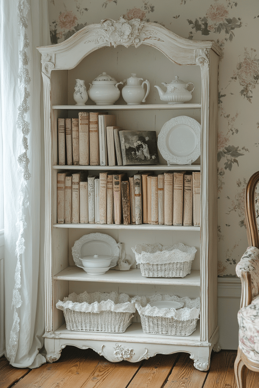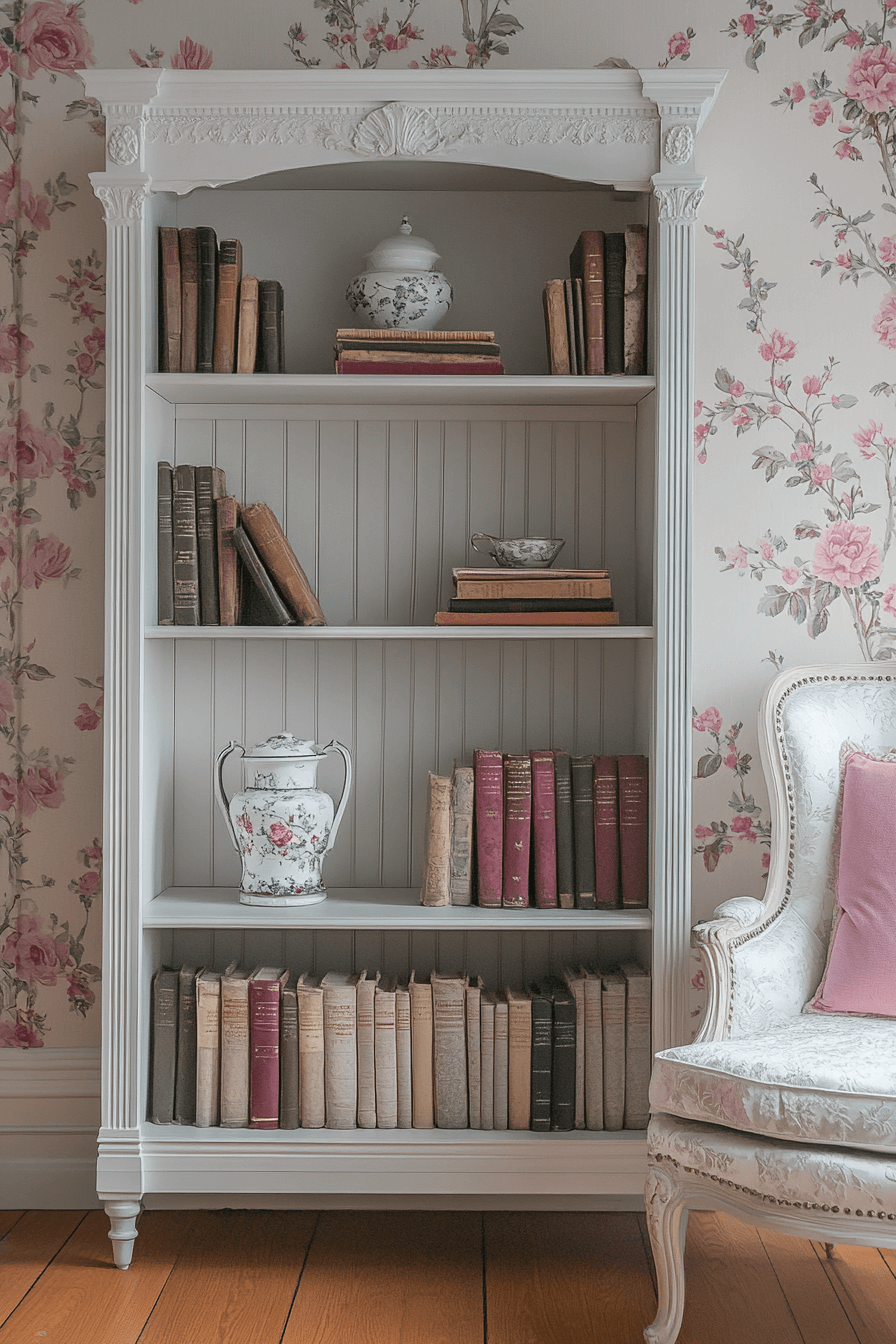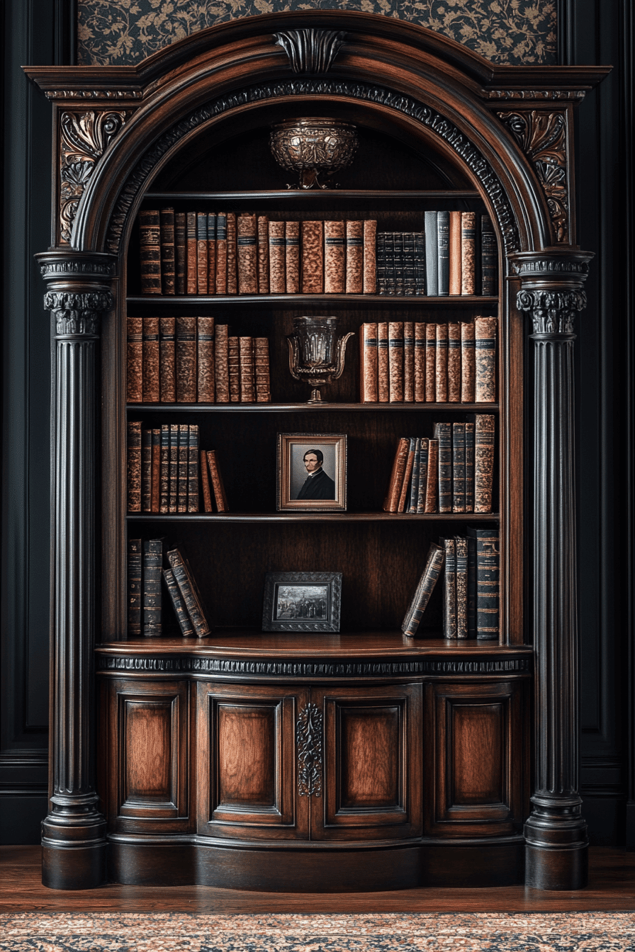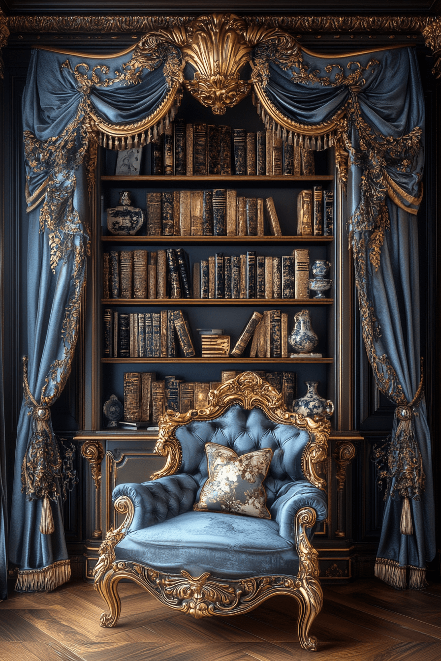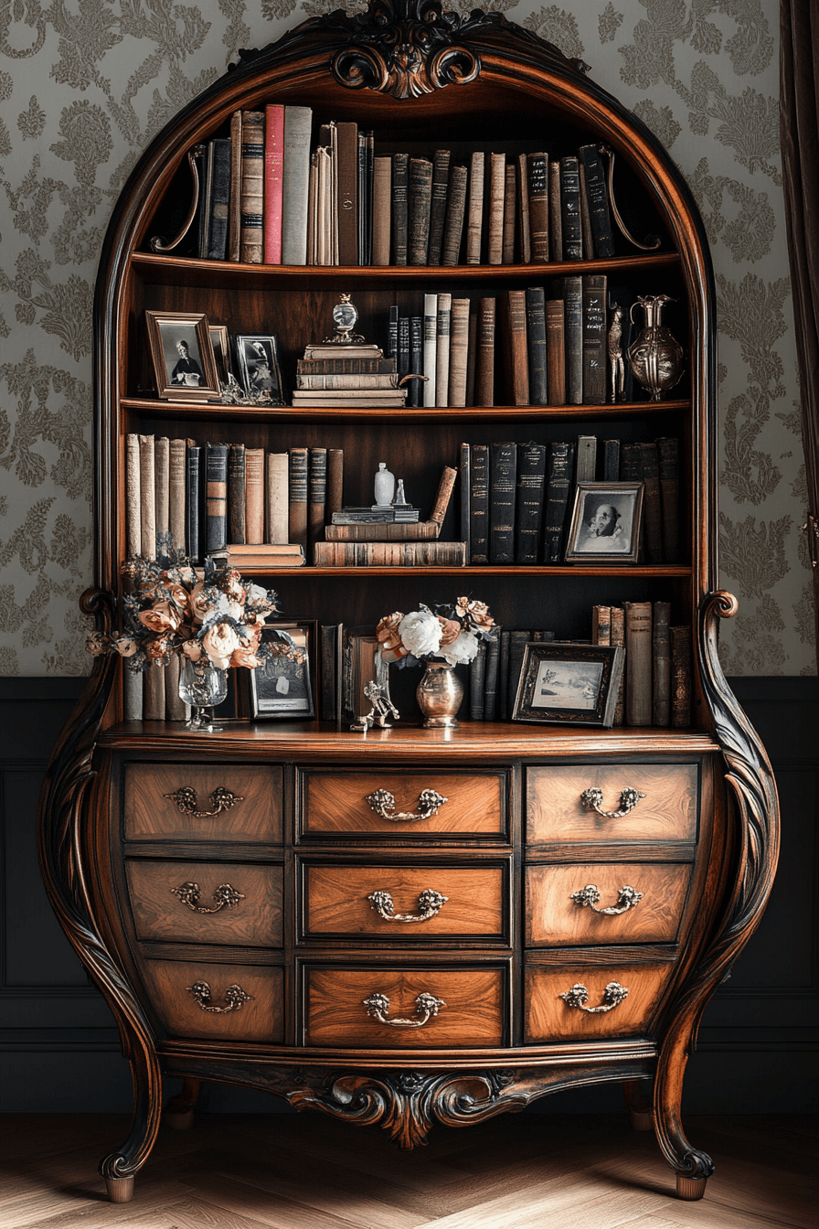 A Baroque ornate book nook transforms your reading corner into an opulent escape within your antique bookshelf scheme. This style is defined by elaborate carvings, scrolling motifs, and gilded finishes that create a rich visual experience. Pair it with tufted seating, dramatic drapery, and oversized antique volumes. The look is luxurious yet intimate, ideal for those who love classic storytelling and layered textures. It turns book storage into theatrical decor. Tap to indulge in old-world elegance for your reading ritual!