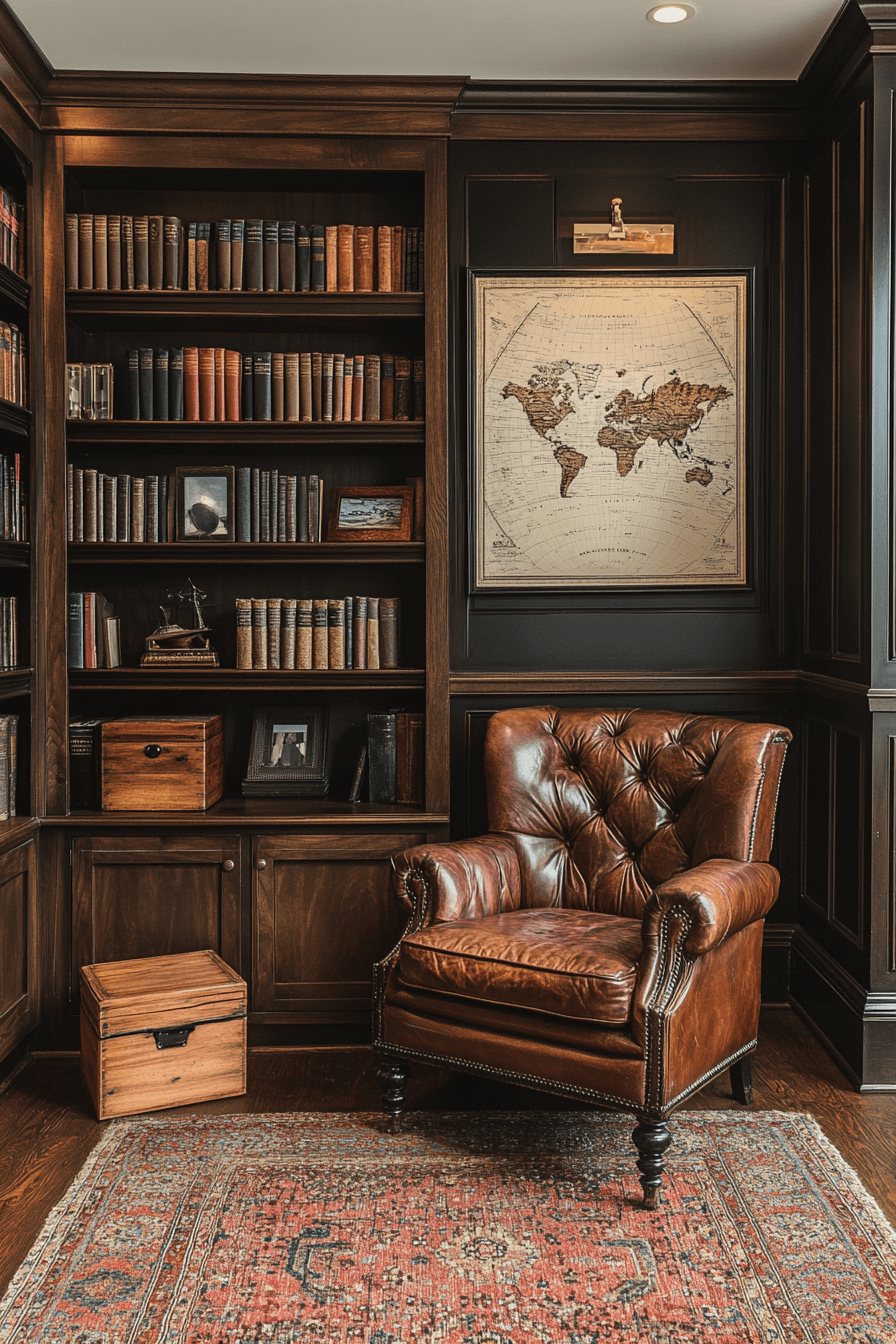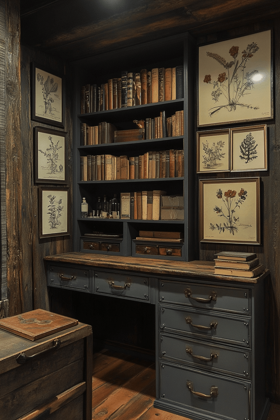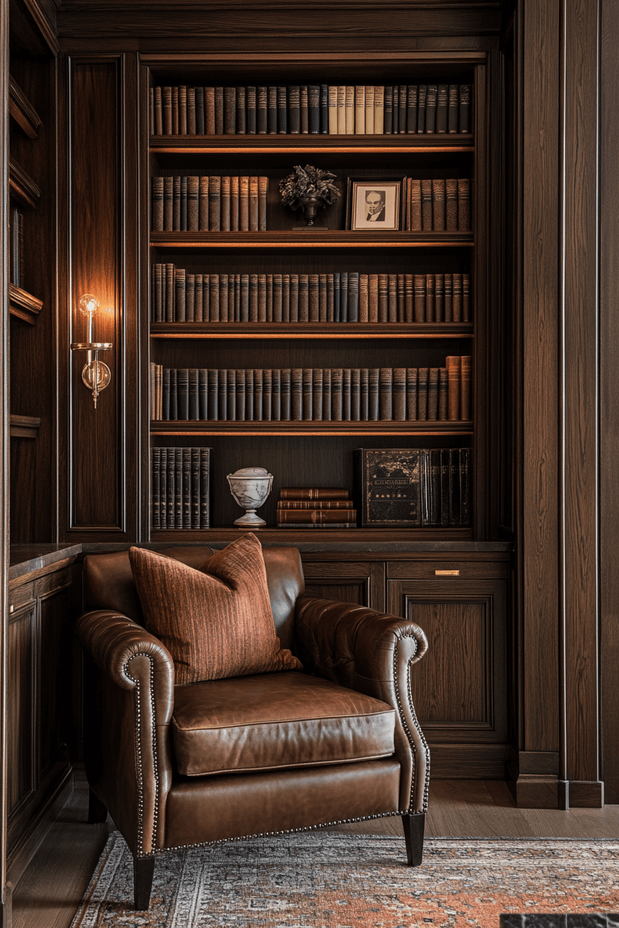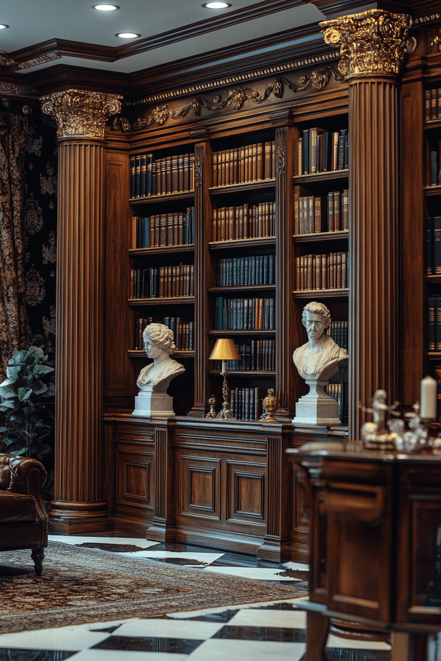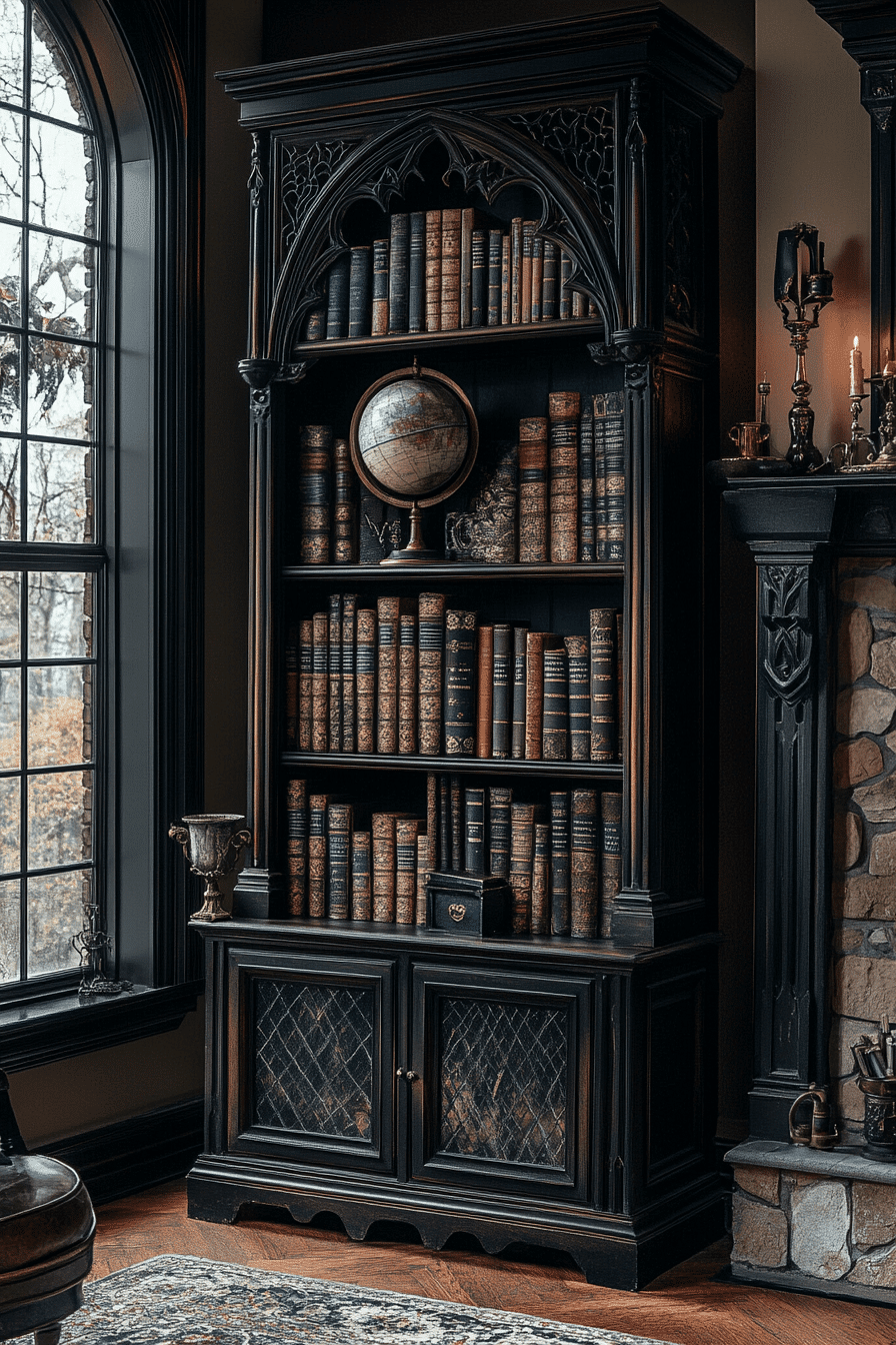 A Baroque ornate book nook transforms your reading corner into an opulent escape within your antique bookshelf scheme. This style is defined by elaborate carvings, scrolling motifs, and gilded finishes that create a rich visual experience. Pair it with tufted seating, dramatic drapery, and oversized antique volumes. The look is luxurious yet intimate, ideal for those who love classic storytelling and layered textures. It turns book storage into theatrical decor. Tap to indulge in old-world elegance for your reading ritual!