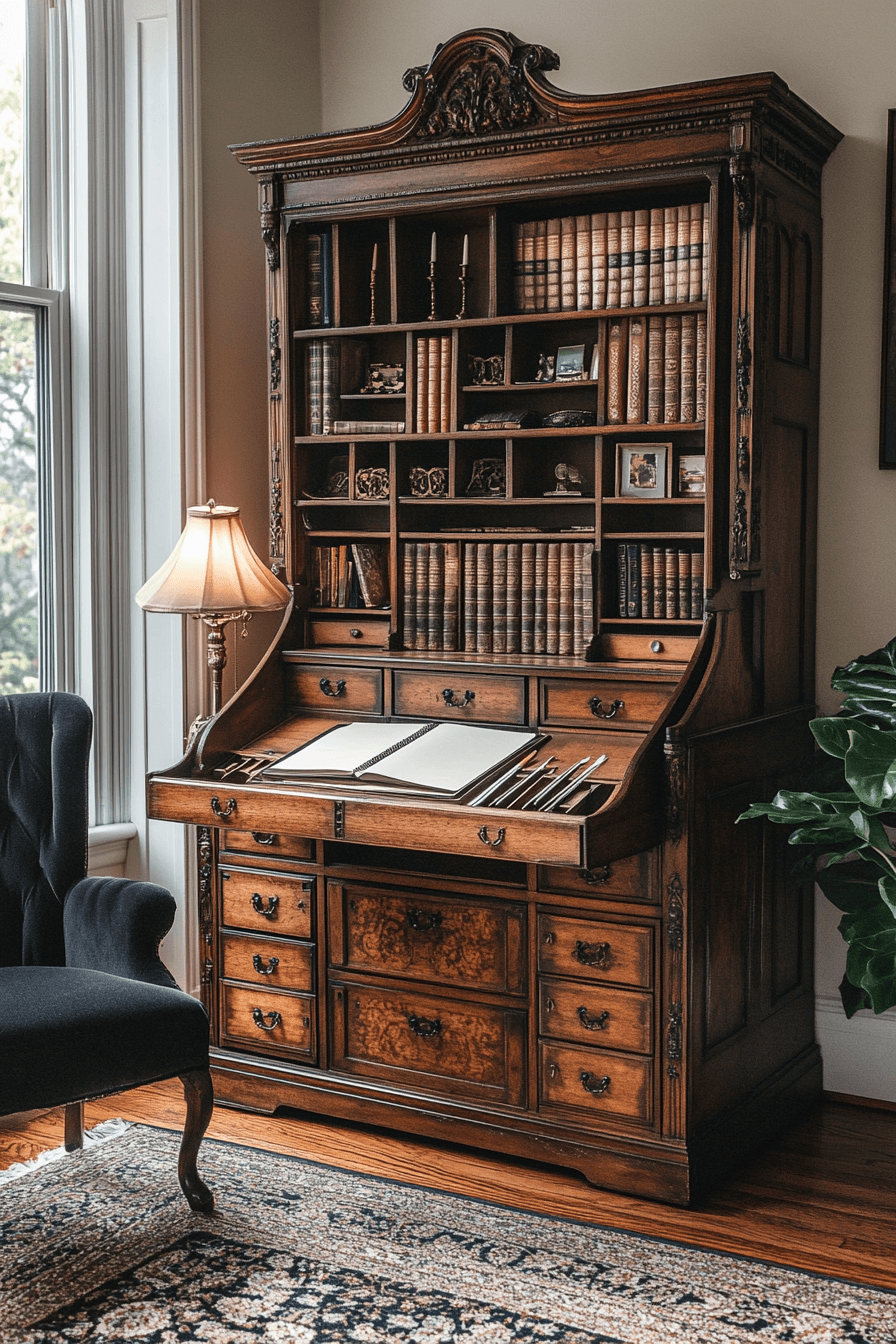The antique secretary bookcase merges storage and workspace in one historically stylish piece. With a fold-down writing surface and hidden compartments, it invites storytelling and daily use. The upper hutch provides shelving for books, while the lower drawers offer concealed storage. Its compact yet impactful form makes it ideal for bedrooms or small studies. Rich wood tones and detailed craftsmanship give it timeless appeal. Tap to turn your antique bookshelf into a refined writing retreat!