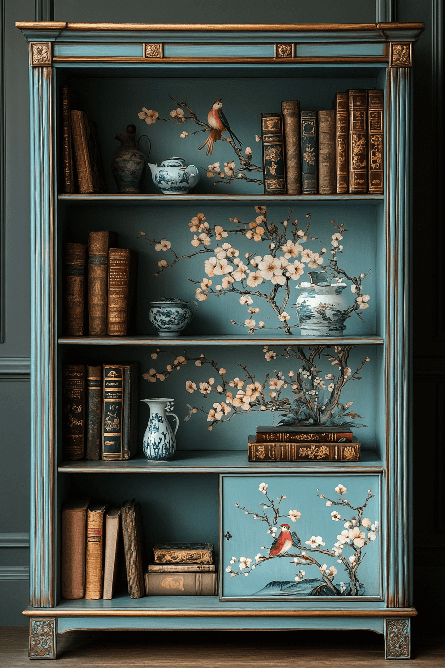 The Chinoiserie bookshelf cabinet introduces a splash of global elegance into your antique bookshelf styling. Hand-painted panels featuring birds, blossoms, or pagoda motifs turn each cabinet into a work of art. With a lacquered finish and gold detailing, it pairs beautifully with curated books and delicate ceramics. The cabinet doors offer enclosed storage, while the upper shelves provide display space. This bookshelf is perfect for eclectic collectors or lovers of East-meets-West interior design. Tap to make your bookshelf feel like a curated gallery!