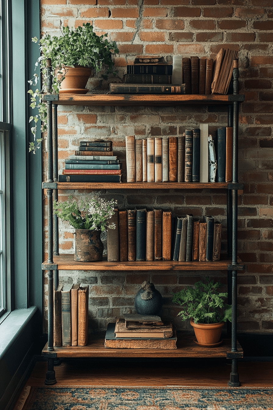 An industrial iron-framed bookshelf provides rugged balance to an antique bookshelf design with its exposed metal structure and weathered wood shelves. Inspired by 19th-century factories and foundries, it merges utility with historical charm. Use it to contrast ornate antiques with raw finishes and open space. It’s a great fit for lofts, studios, or eclectic mixes of decor. The blend of strength and minimalism keeps the look grounded and versatile. Tap to add edge and durability to your antique aesthetic!