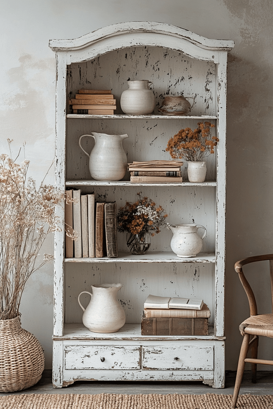 A weathered white bookcase brings light and vintage charm to any antique bookshelf design. The distressed paint finish reveals layers of history, creating a beautiful worn-in effect. Its open shelving offers ample space for books, ceramics, and treasured keepsakes. This piece shines in shabby chic, farmhouse, or coastal-inspired interiors. The neutral color palette makes it easy to mix with both wood tones and soft textiles. Tap to create a space that feels both bright and rooted in time!