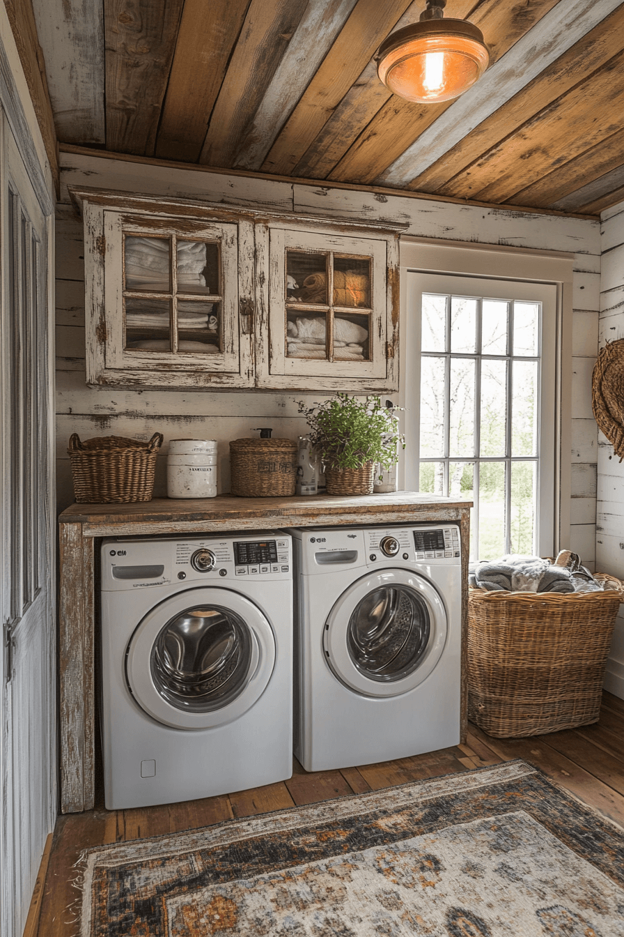 An antique washboard or rustic cabinet is among the most delightful antique farmhouse decor ideas for a laundry room. These pieces combine vintage charm with real utility. Their worn textures and nostalgic look turn chores into cheerful moments. They perfectly balance history and practicality.