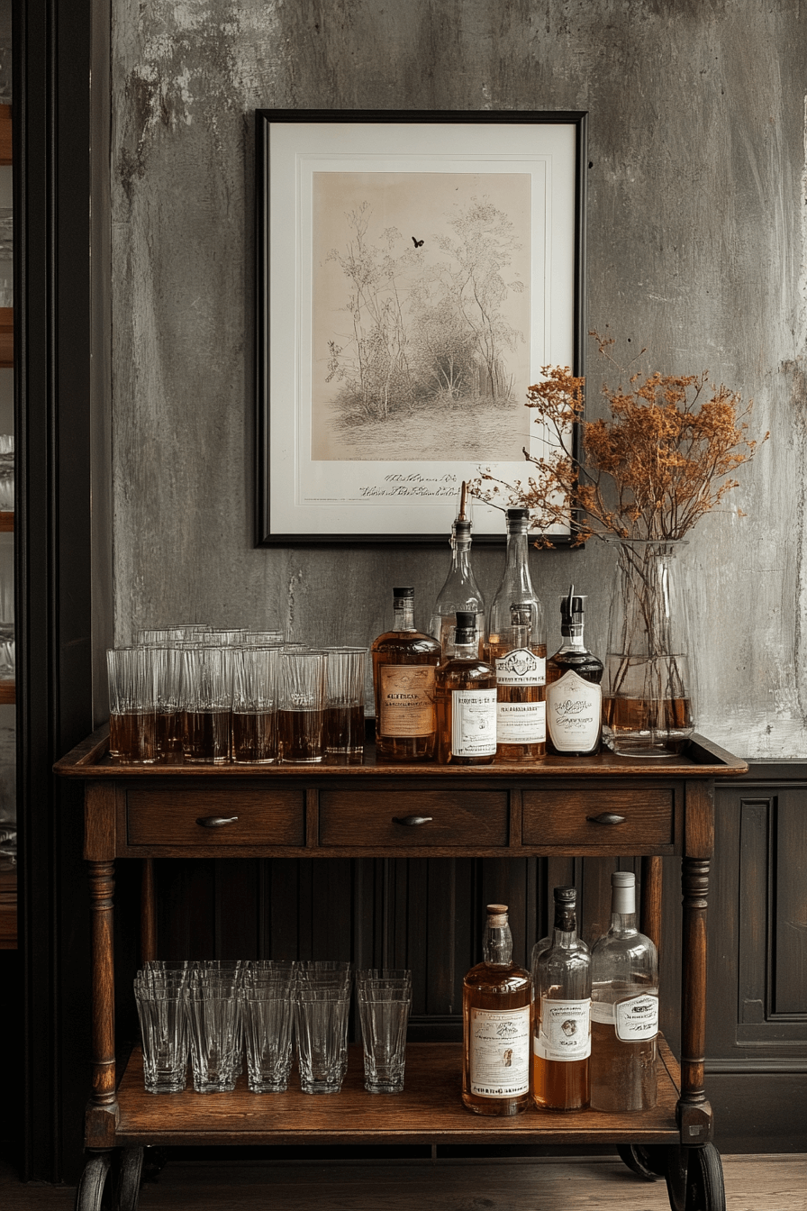 A classic bar area accent is one of the most social antique farmhouse decor ideas for your home. Vintage bar carts and stools make hosting both stylish and nostalgic. They mix rustic wood and aged metal for a perfectly worn-in look. Every sip feels steeped in old-world charm.