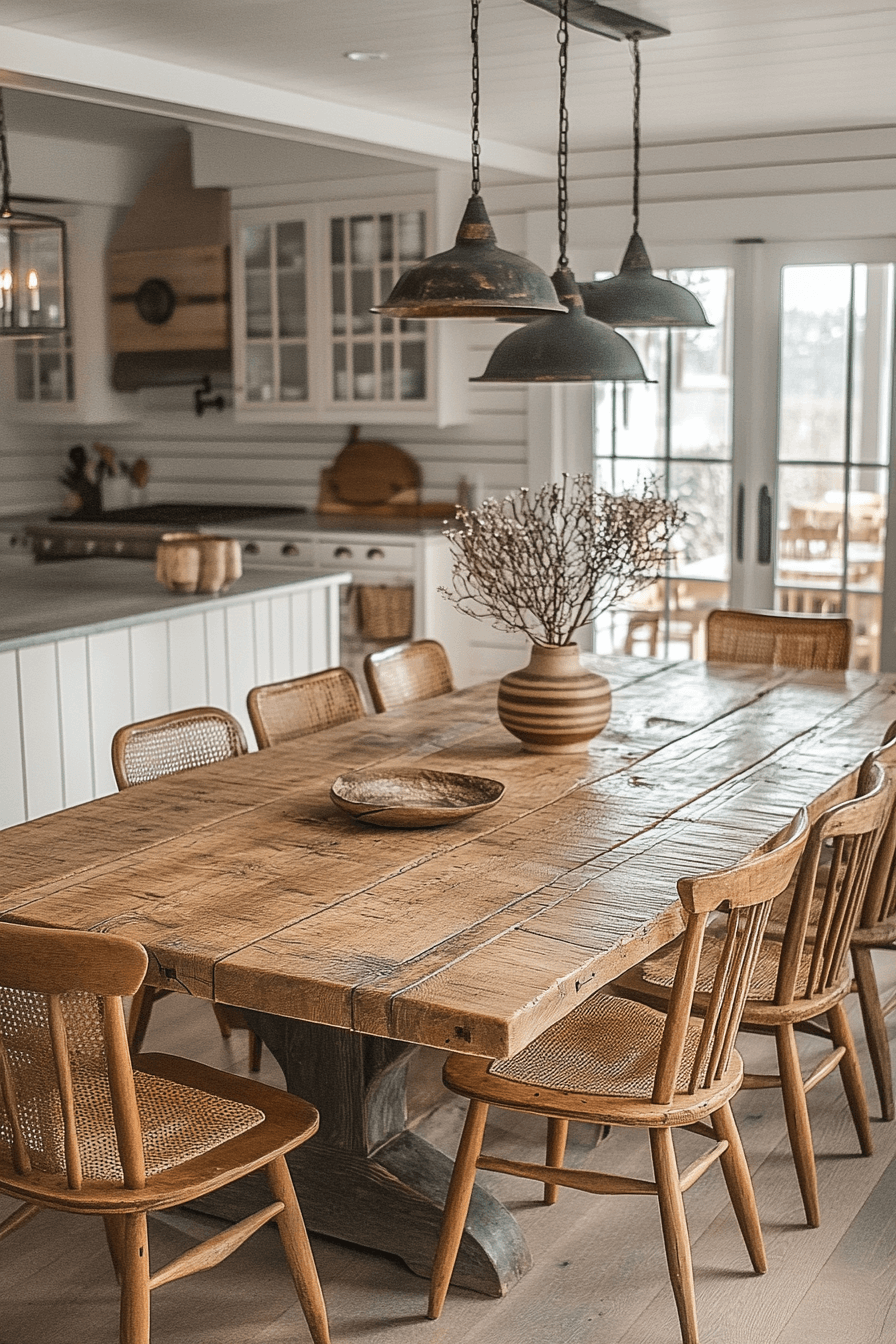 A rustic dining room table stands as the centerpiece of many antique farmhouse decor ideas, uniting family and friends around authentic craftsmanship. Its rich, timeworn wood and sturdy design echo the simplicity of country living. The table’s natural texture and warm tones bring a sense of history to every meal. It’s a timeless staple that makes your dining area feel welcoming and lived-in.