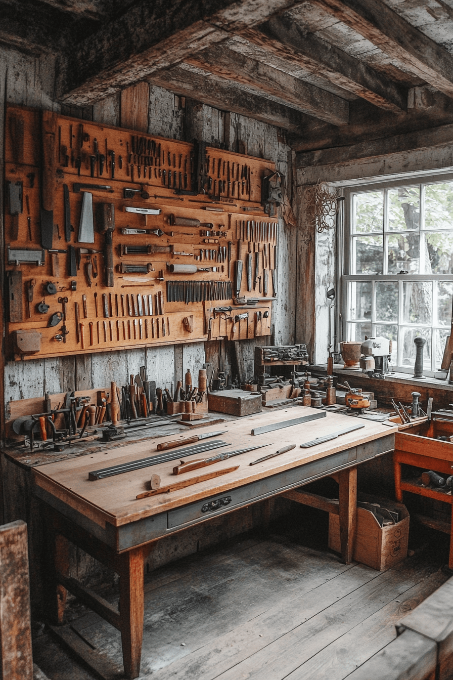 Showcasing a vintage work tool is one of the most authentic antique farmhouse decor ideas for a workshop. Handcrafted planes, saws, or wrenches double as décor and conversation starters. They symbolize craftsmanship and dedication passed down through generations. These details add genuine warmth to your workspace.