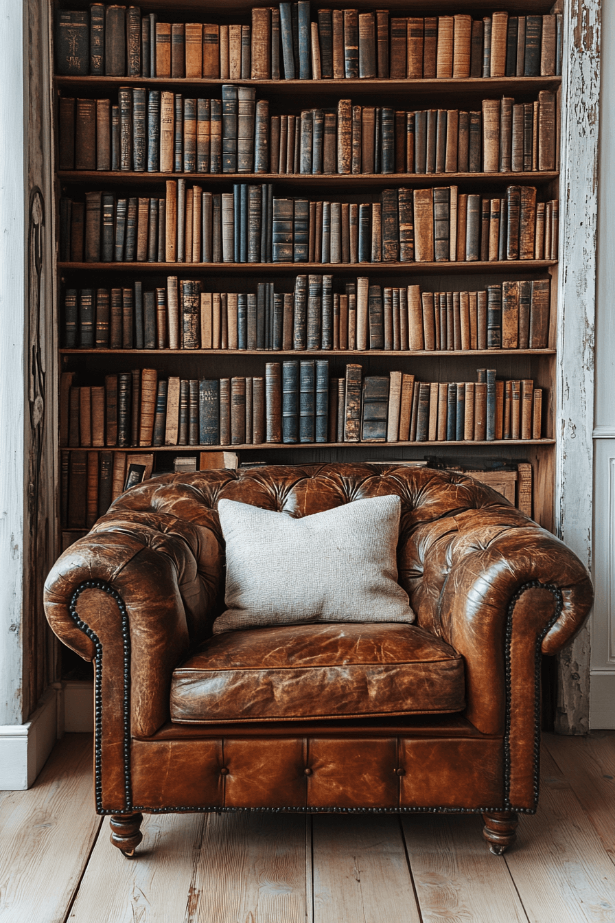 A heritage library shelf filled with old books is one of the most sophisticated antique farmhouse decor ideas for literature lovers. Rich wood tones and aged bindings create instant coziness. The design evokes the feeling of an old-world study. It’s both functional and full of nostalgic elegance.
