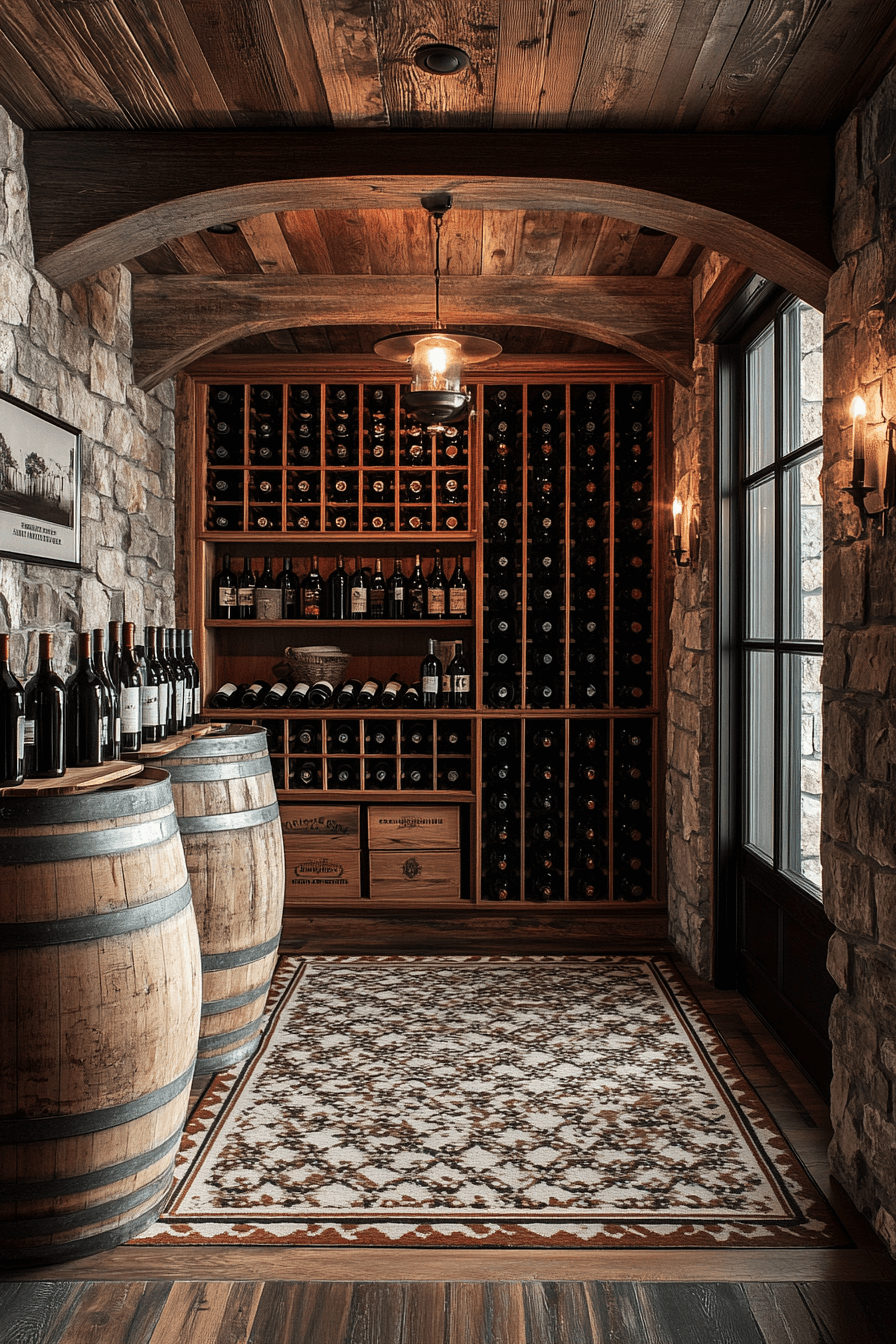 Rustic wine racks and repurposed barrels are standout antique farmhouse decor ideas for wine cellars. They showcase timeless craftsmanship while keeping your collection beautifully organized. The wood grain and patina tell a story of age and artistry. This blend of style and tradition elevates every tasting.