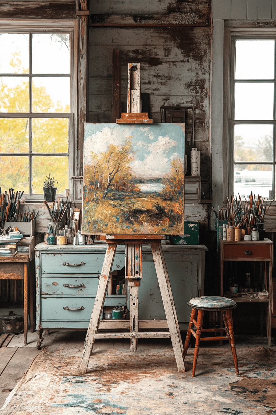 Designing an art studio inspired by history is one of the most inspiring antique farmhouse decor ideas for creatives. A vintage easel, classic brushes, and reclaimed furniture bring soul to your workspace. The imperfections in each item tell a story of passion and artistry. The environment fuels imagination and calm.