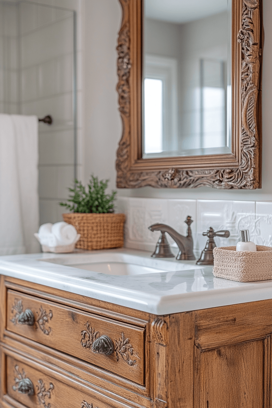 Adding an antique vanity is one of the most stunning antique farmhouse decor ideas for a refined bathroom upgrade. Carved wood details, vintage mirrors, and aged hardware infuse the space with luxurious history. These pieces provide practical storage while feeling effortlessly romantic and classic. The old-world charm pairs perfectly with modern touches for a timeless finish.